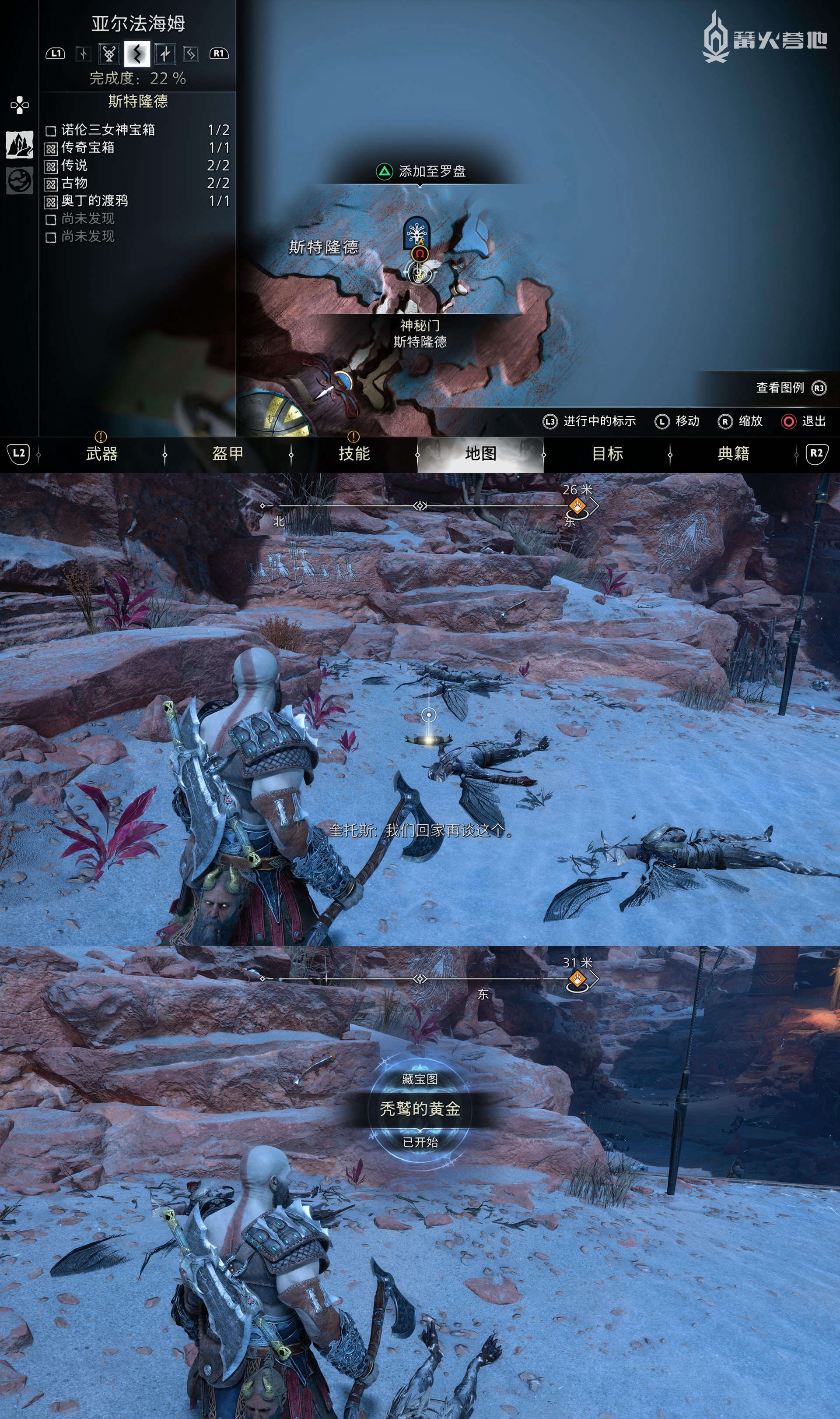 在「亚尔法海姆 - 峡谷」,面对「神秘门 - 斯特隆德」往右前方走(主线剧情离开光之神庙后解锁),可以找到「藏宝图 - 秃鹫的黄金」。
