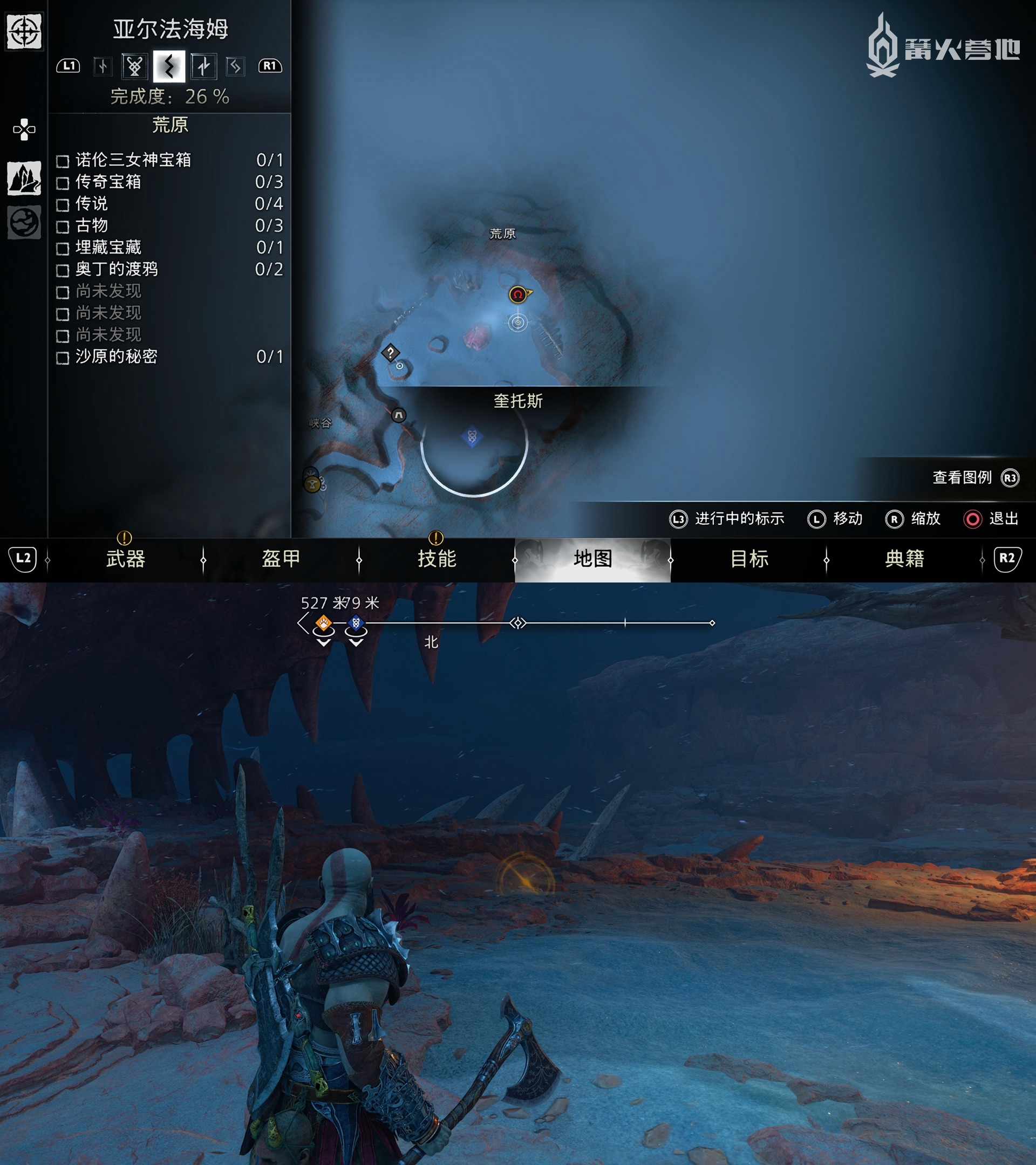 在「亚尔法海姆 - 荒原」,下图位置巨大的生物骨头里面,可以找到「藏宝图 - 秃鹫的黄金」的宝藏,获得「配件 - 致命引爆」。