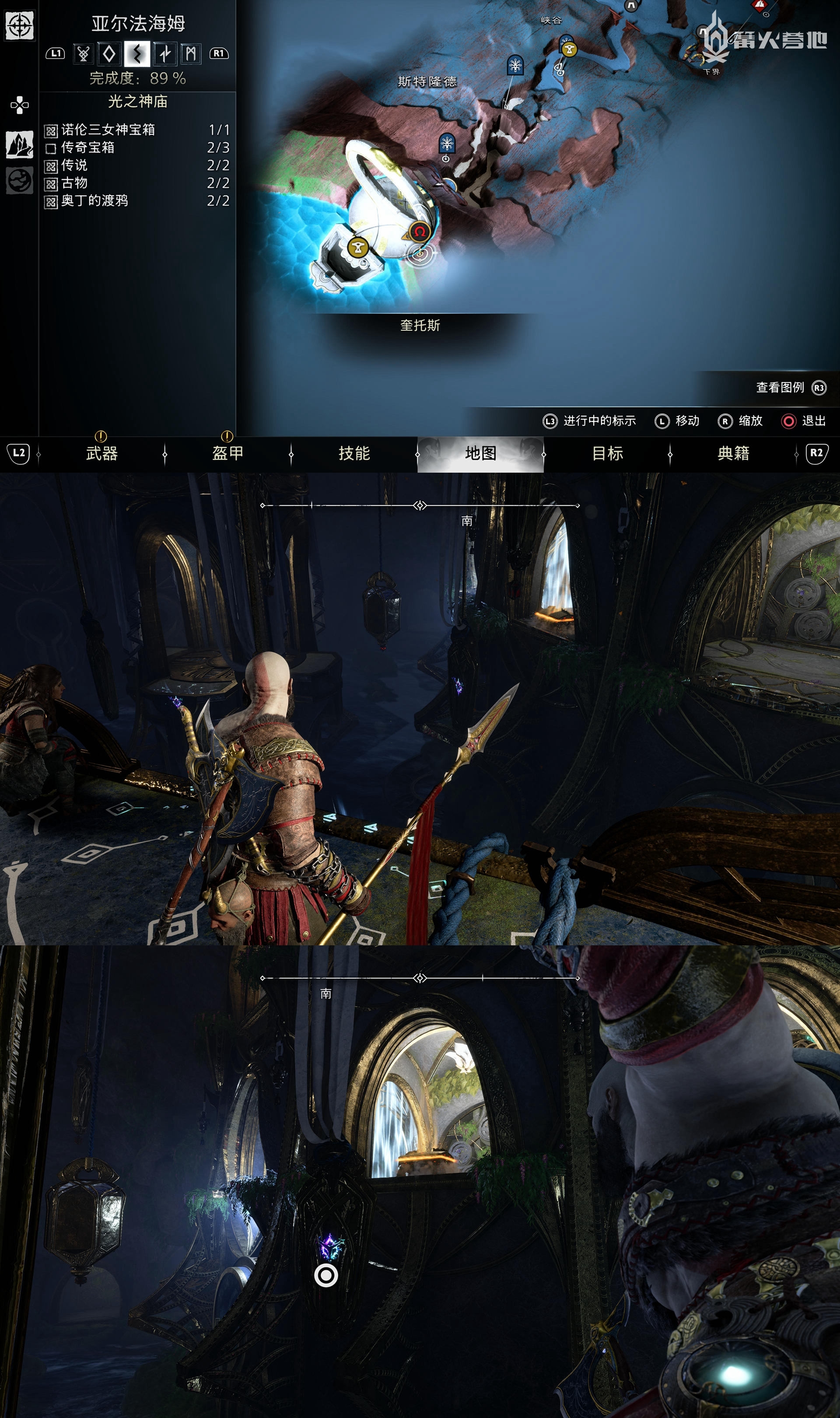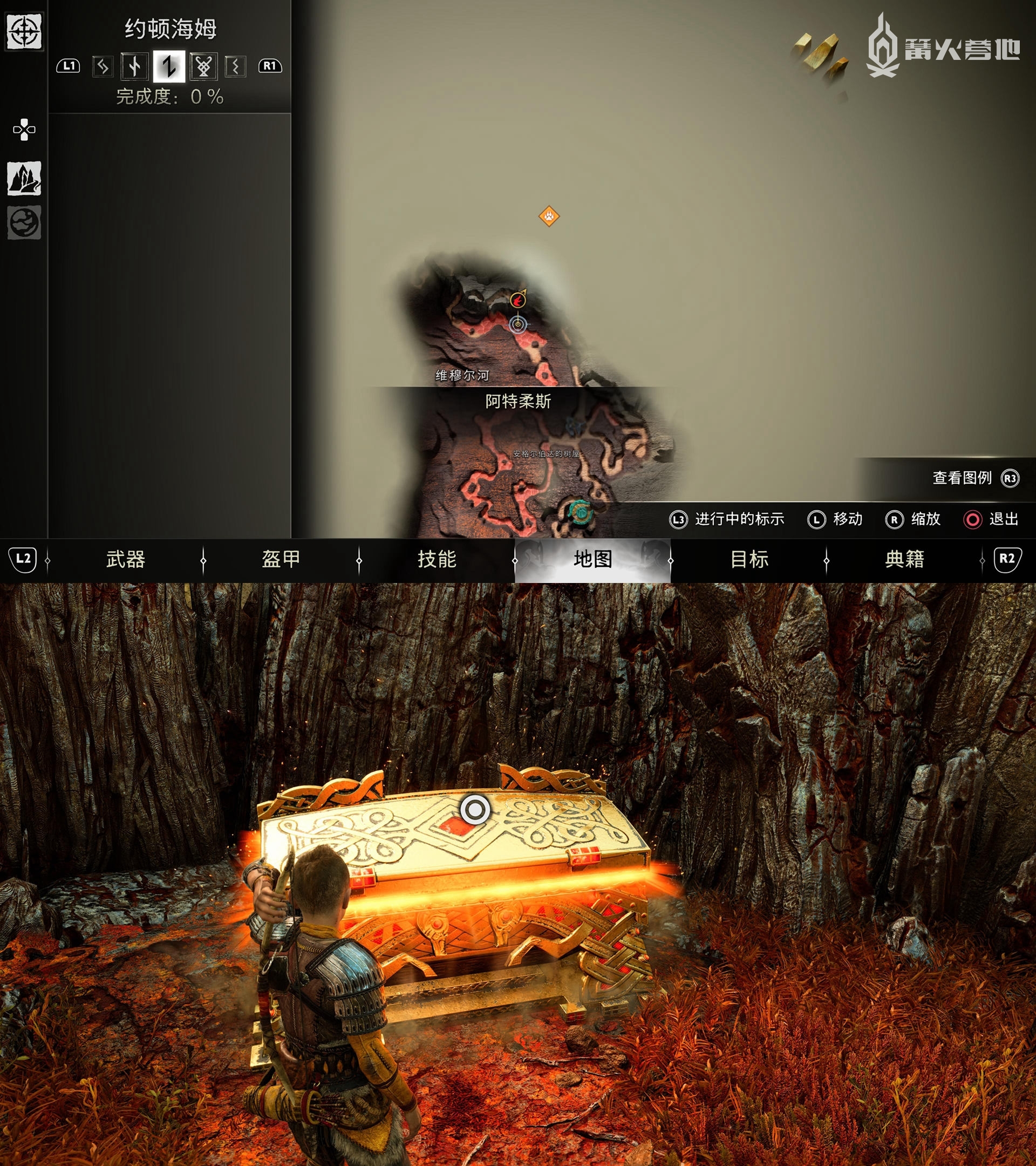 在「米德加尔特 - 失落的宝藏」,先通过爬到右上层,打爆炸弹,下去向左拖动圆盘,然后从圆盘爬到左上层来到右上层,把柱子推到圆盘处,再把圆盘向右拖卡住柱子,再拉动机关,用斧子和符文箭同时定住两个机关,即可进入前方的房间内,找到「传奇宝箱」,拿到「配件 - 魔符惩罚」。