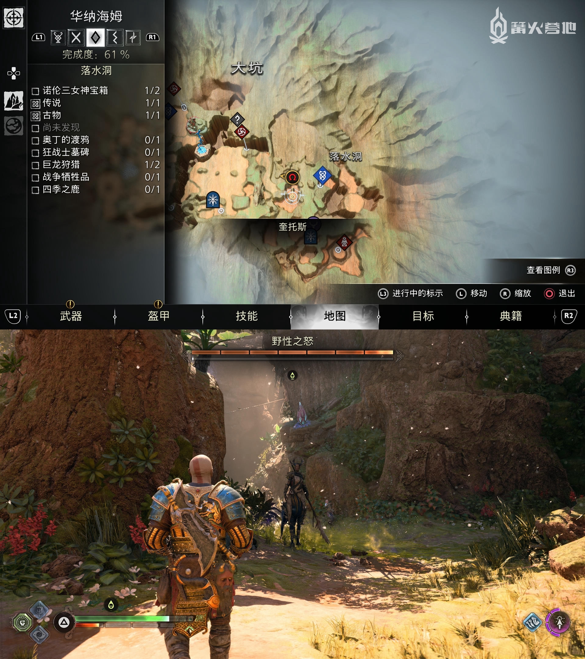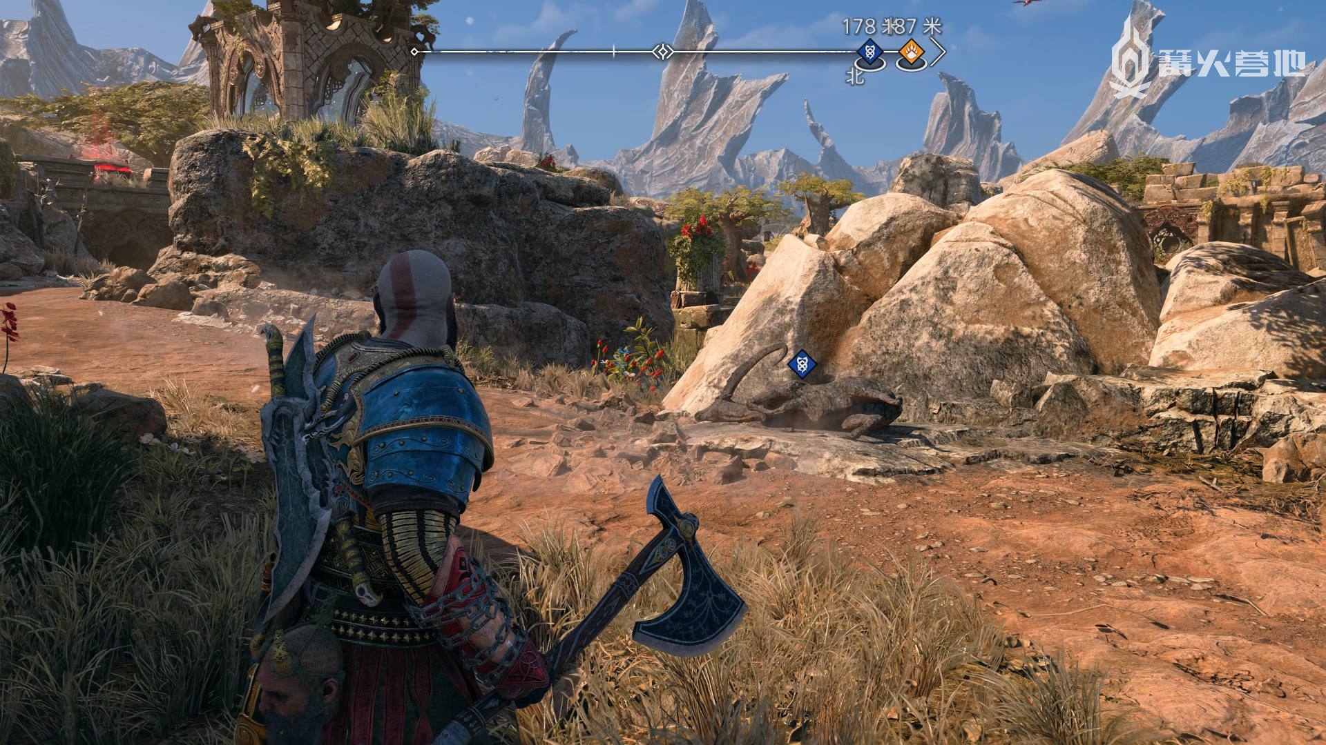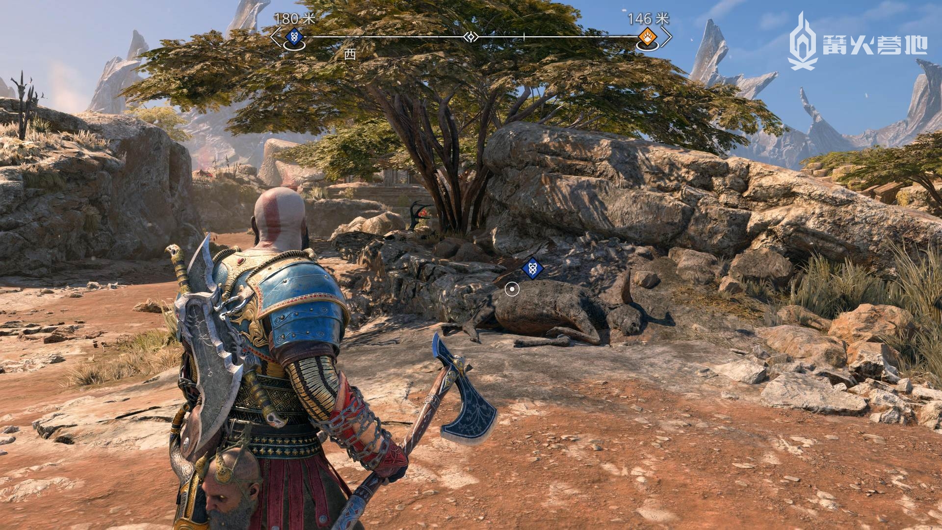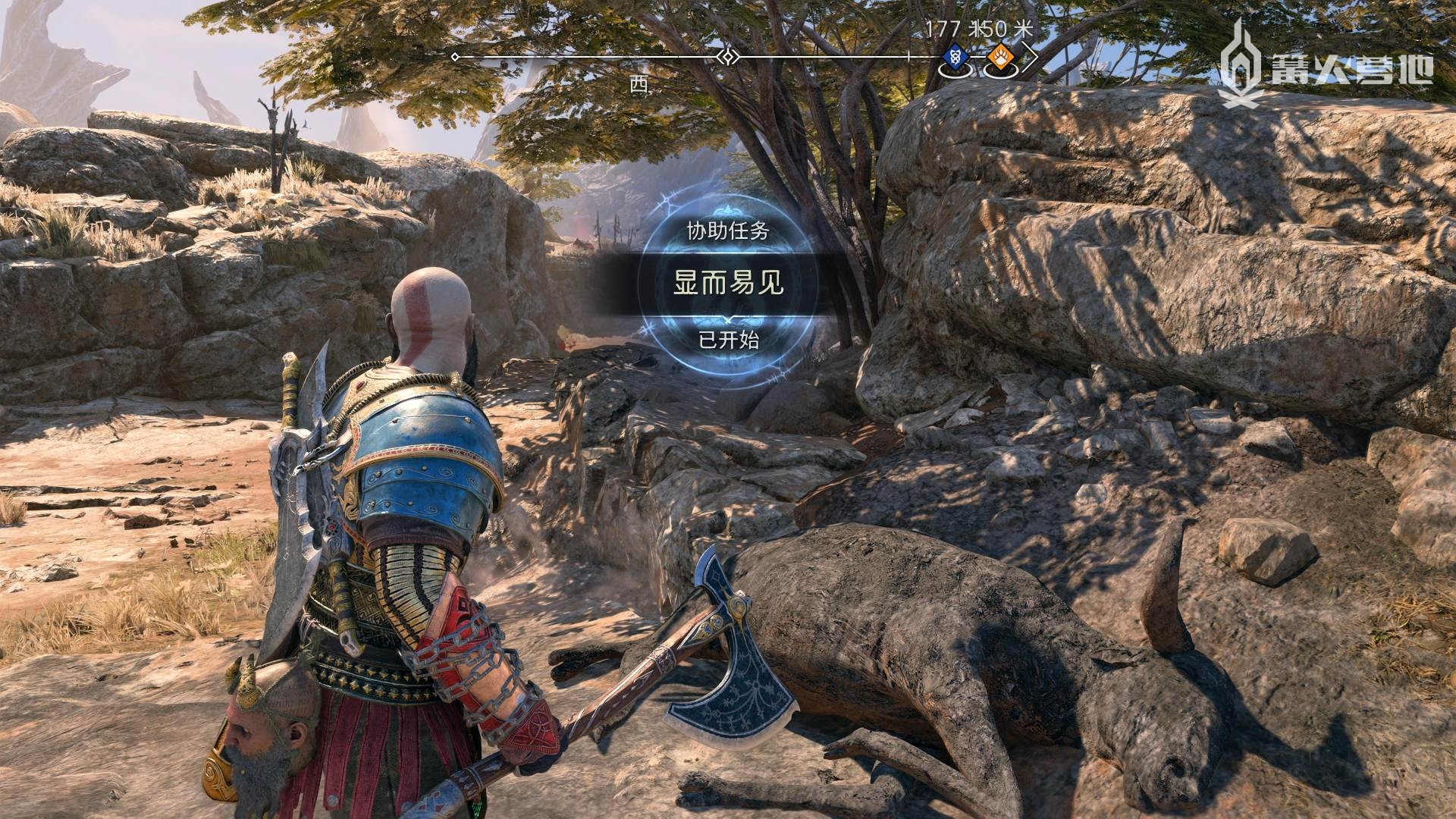 ① 推进《战神 诸神黄昏》主线流程至救出弗雷,并完成支线任务「幸存者的气味」后,会来到华纳海姆北边的全新大坑地图。在「华纳海姆 - 平原」,下图位置调查动物尸体会触发支线任务「显而易见」。