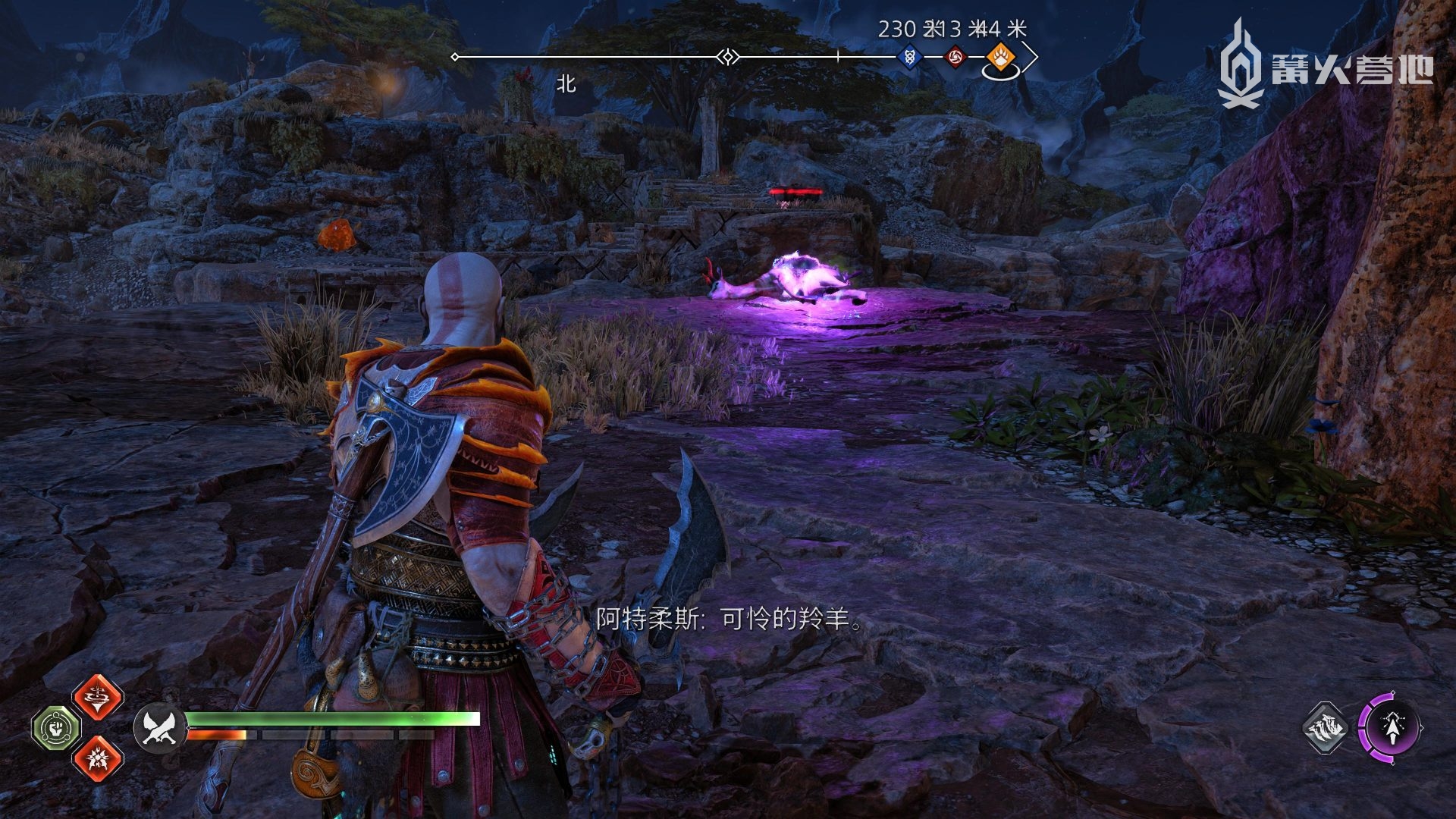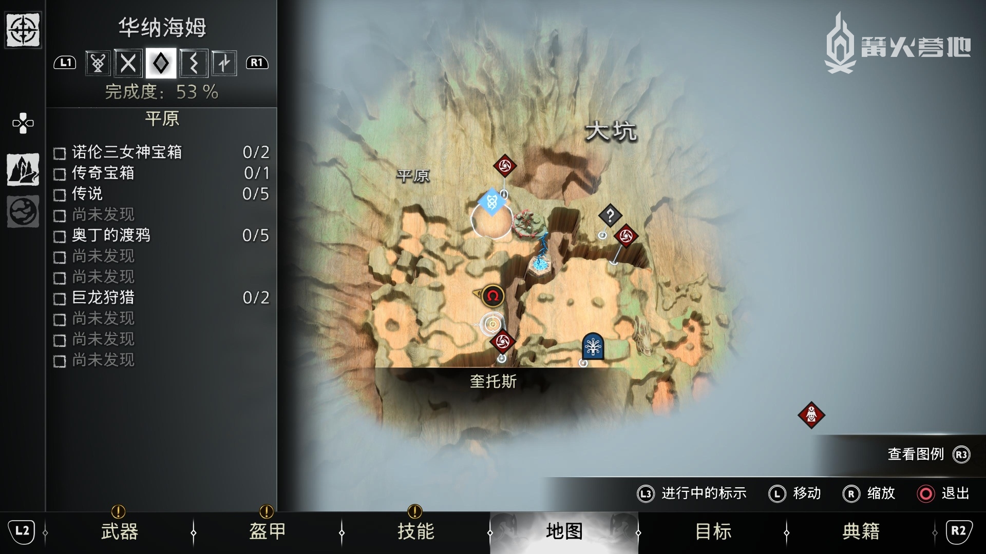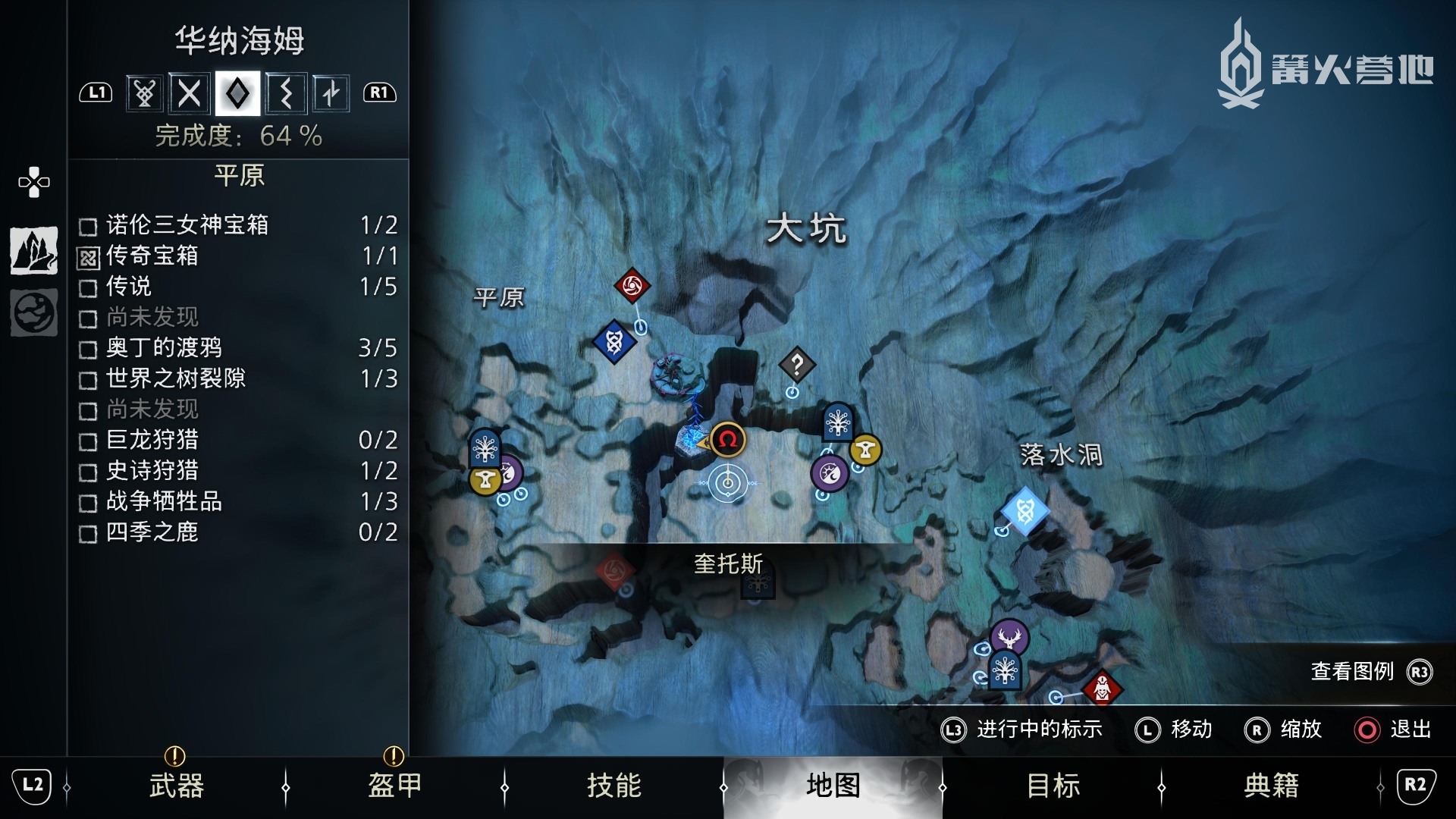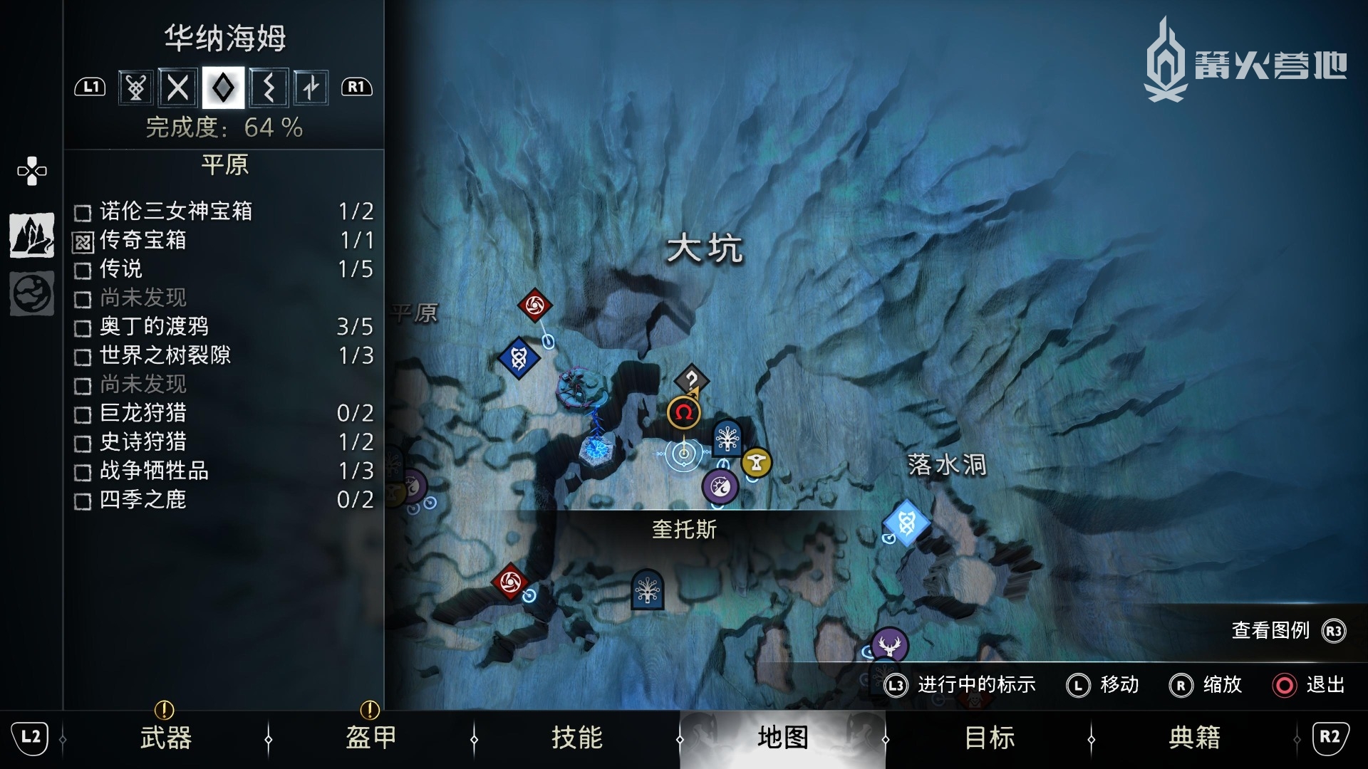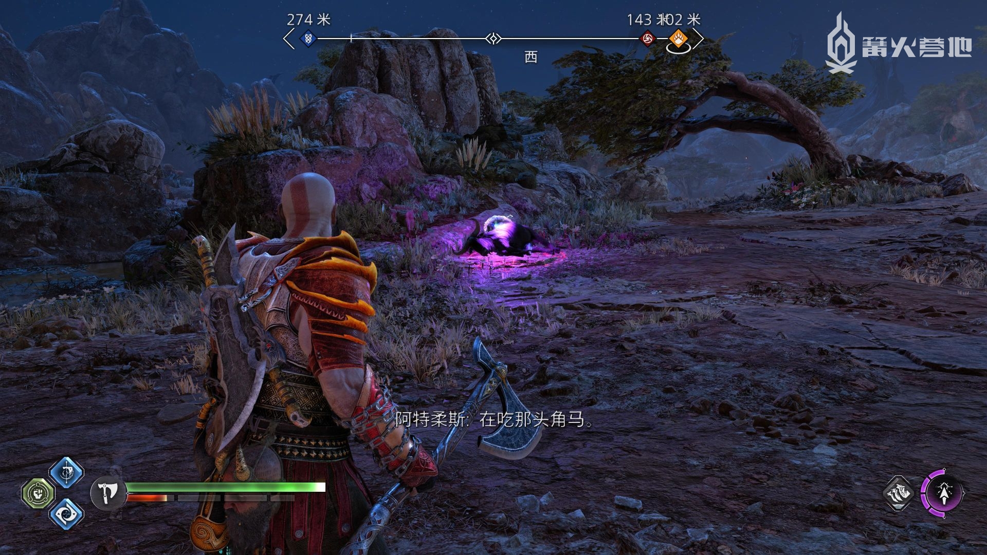 ① 推进《战神 诸神黄昏》主线流程至救出弗雷,并完成支线任务「幸存者的气味」后,会来到华纳海姆北边的全新大坑地图。在「华纳海姆 - 平原」,下图位置调查动物尸体会触发支线任务「显而易见」。