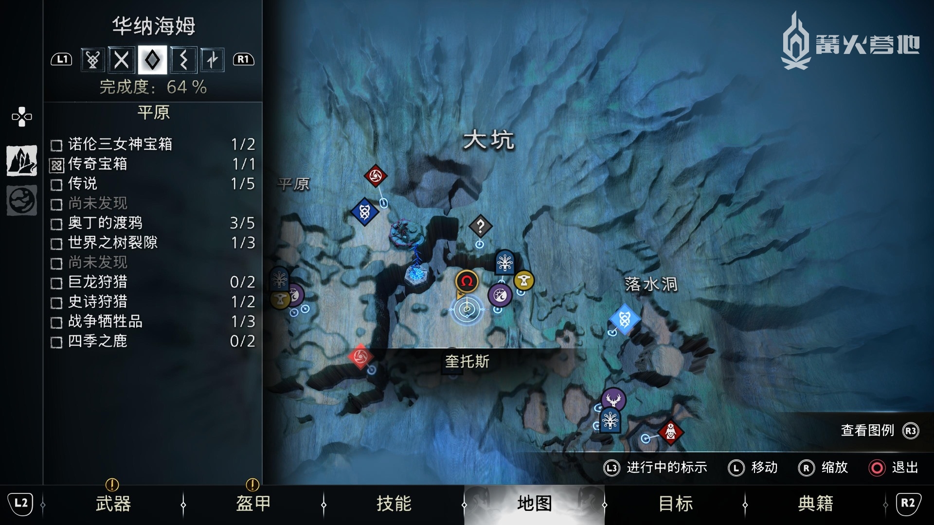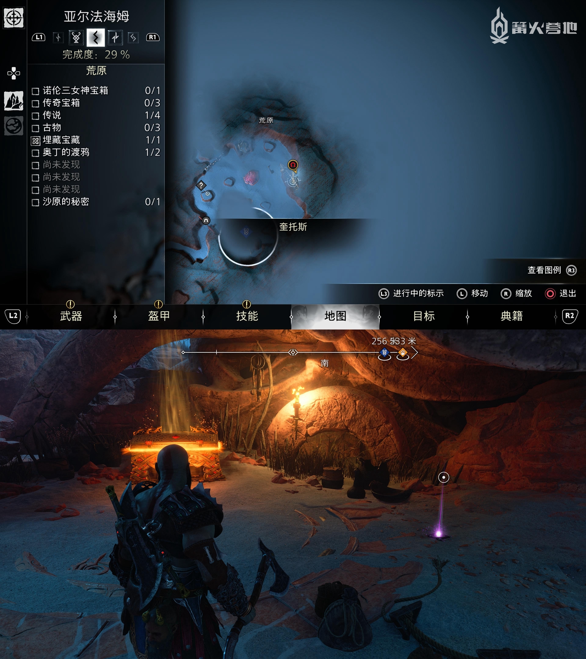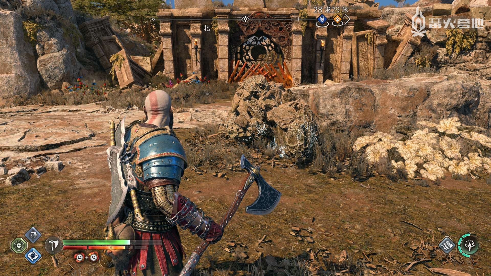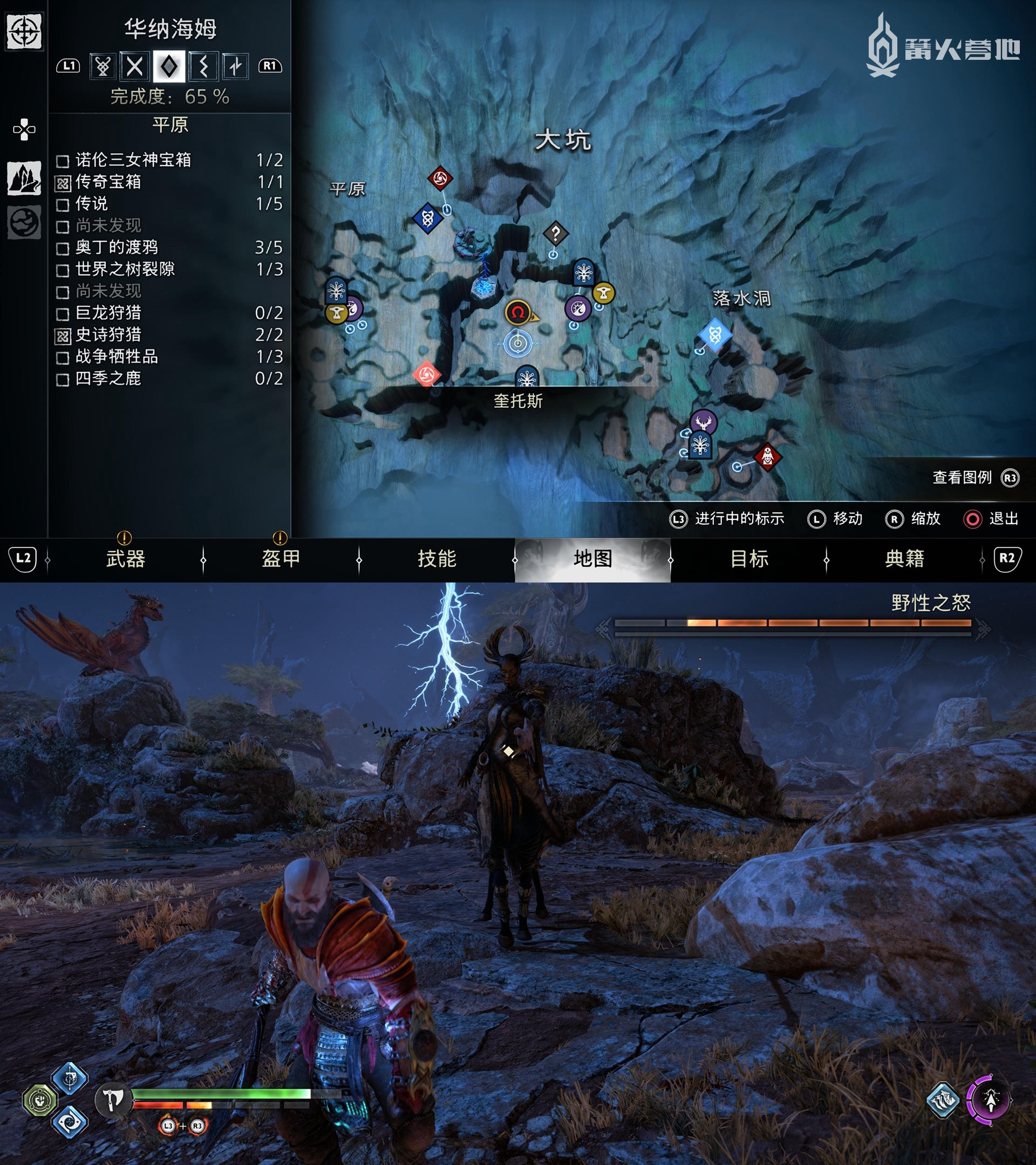 ① 推进《战神 诸神黄昏》主线流程至救出弗雷,并完成支线任务「幸存者的气味」后,会来到华纳海姆北边的全新大坑地图。在「华纳海姆 - 平原」,下图位置调查动物尸体会触发支线任务「显而易见」。