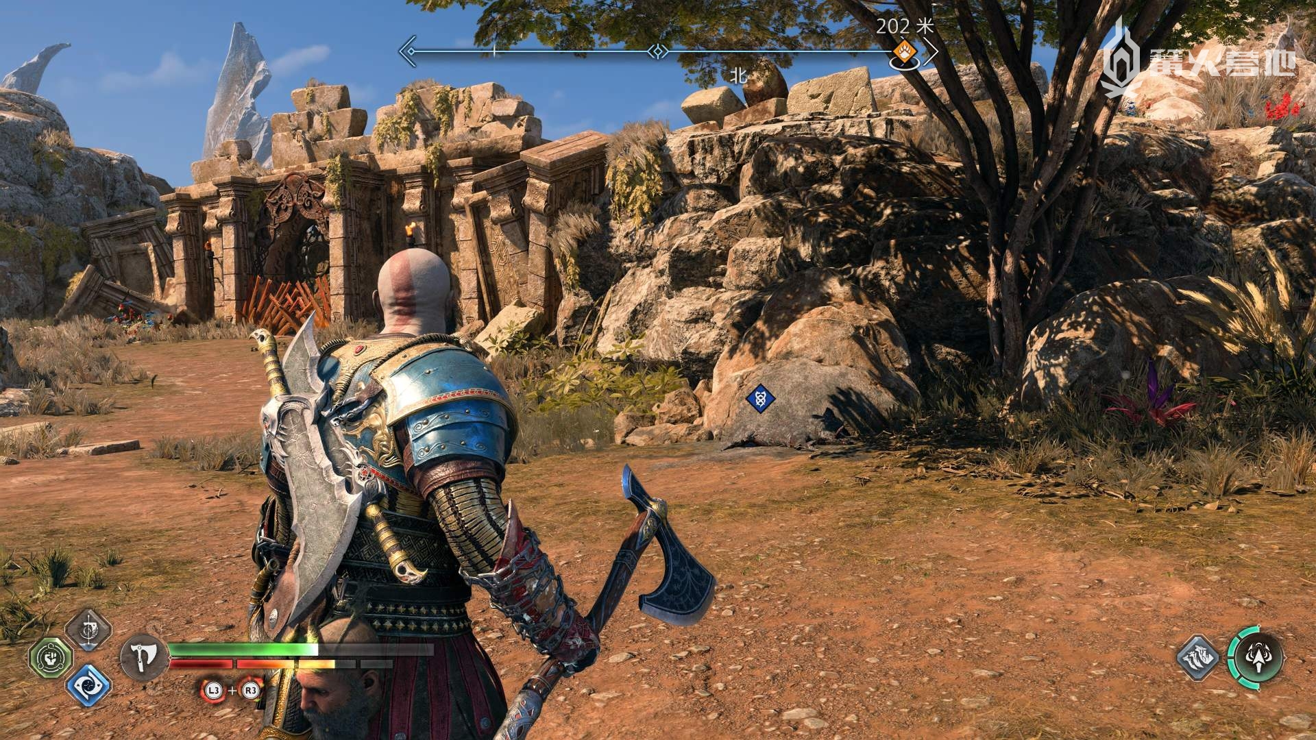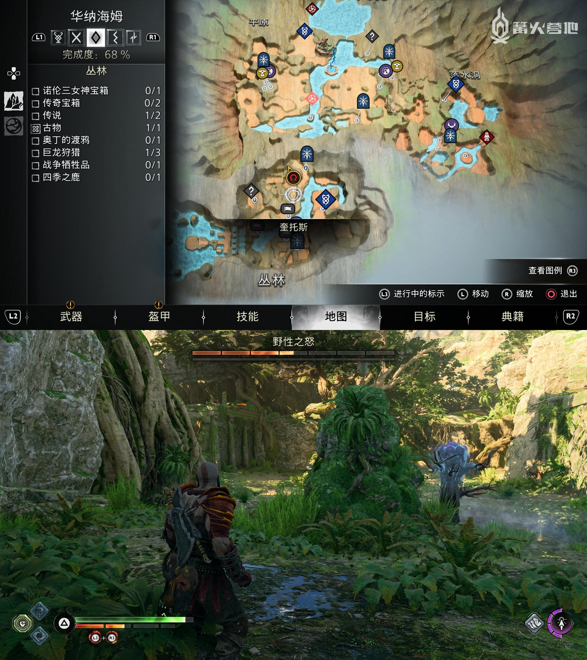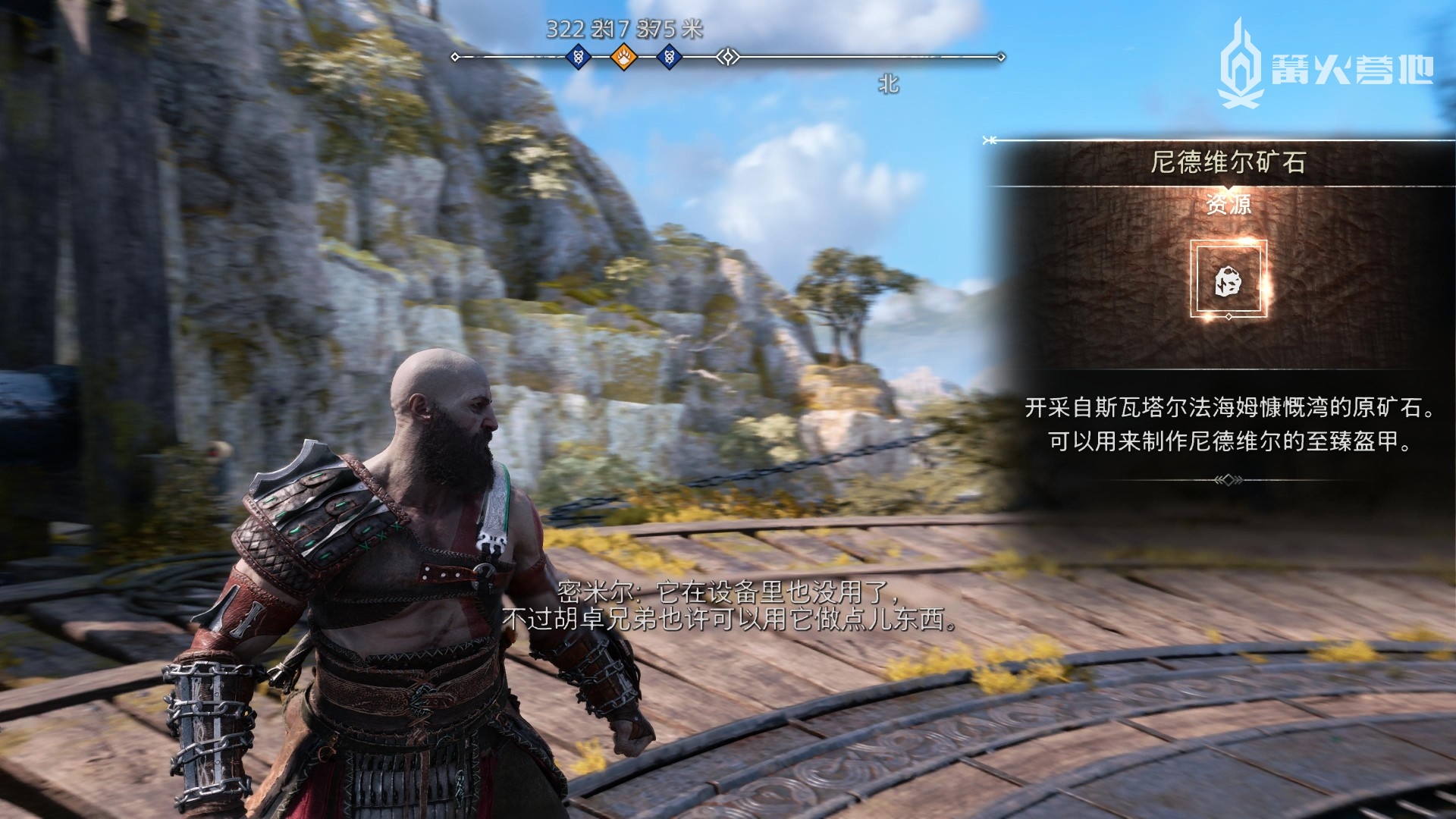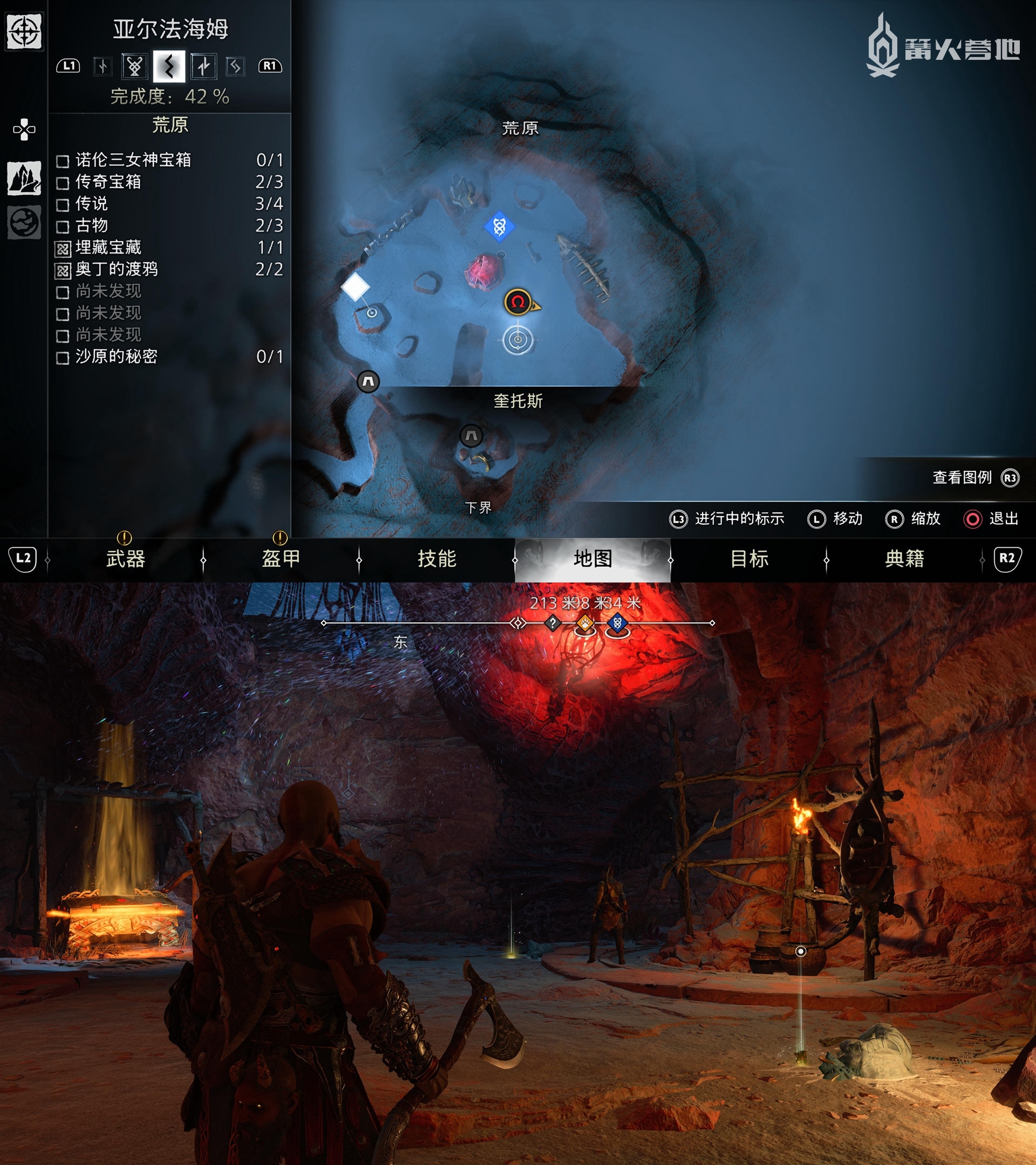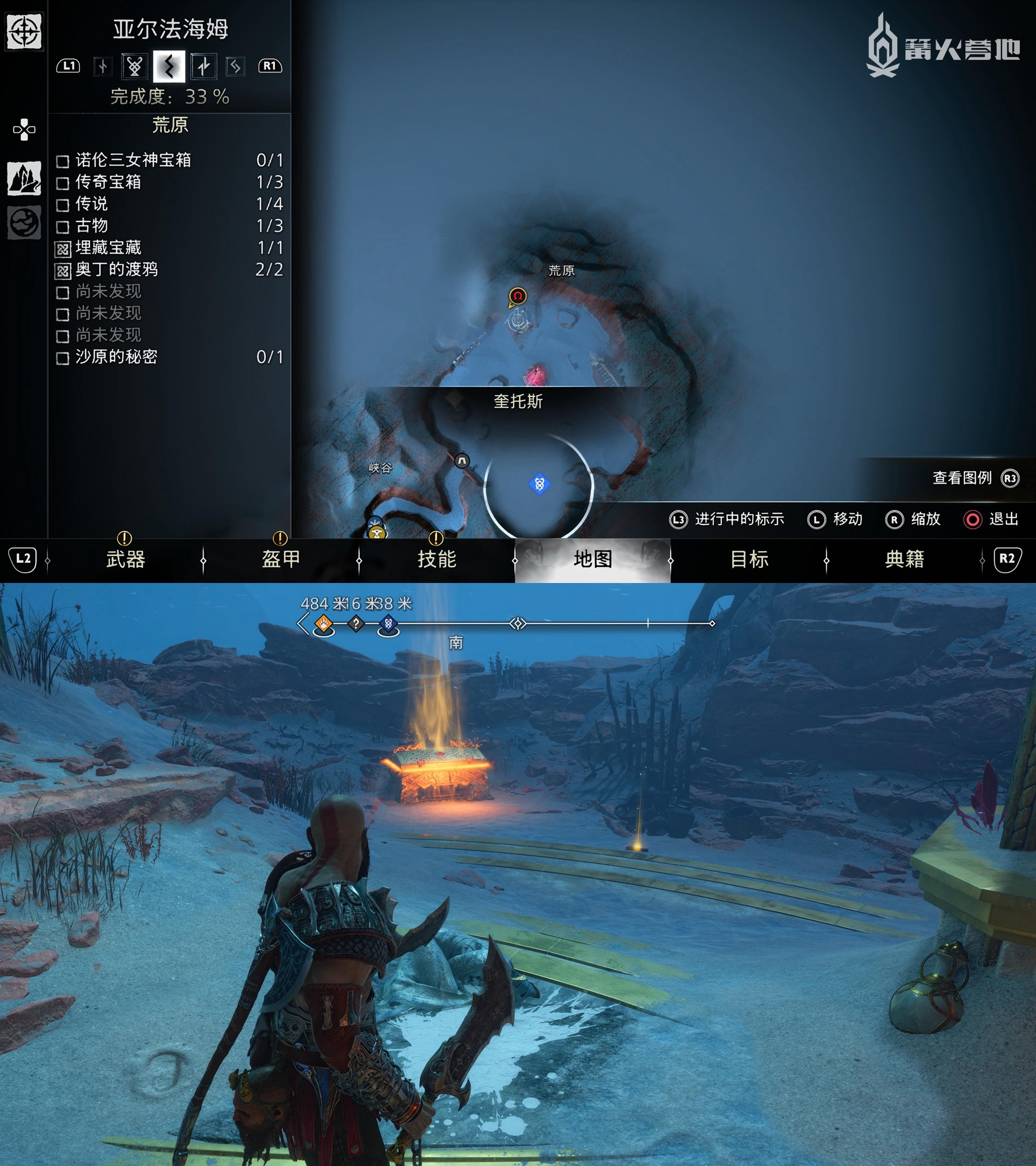 ① 推进《战神 诸神黄昏》主线流程至救出弗雷,并完成支线任务「幸存者的气味」后,会来到华纳海姆北边的全新大坑地图。在「华纳海姆 - 平原」,下图位置调查动物尸体会触发支线任务「显而易见」。
