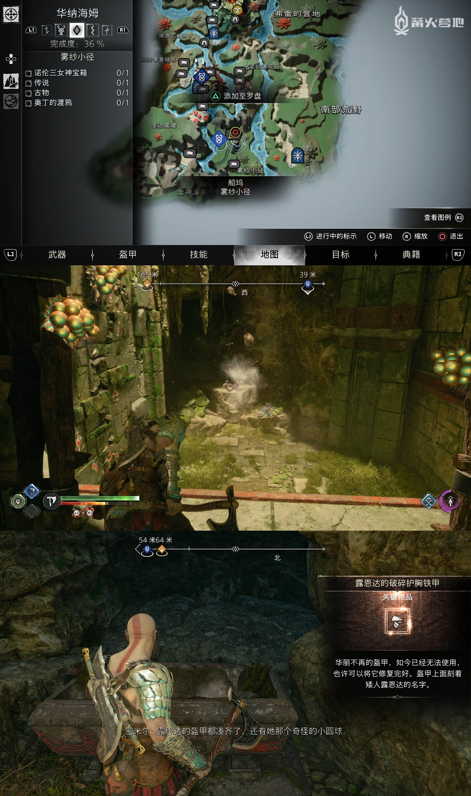 在「华纳海姆 - 雾纱小径」,下图位置可以找到宝箱,打开获得「关键物品 - 露恩达的破碎护胸铁甲」。