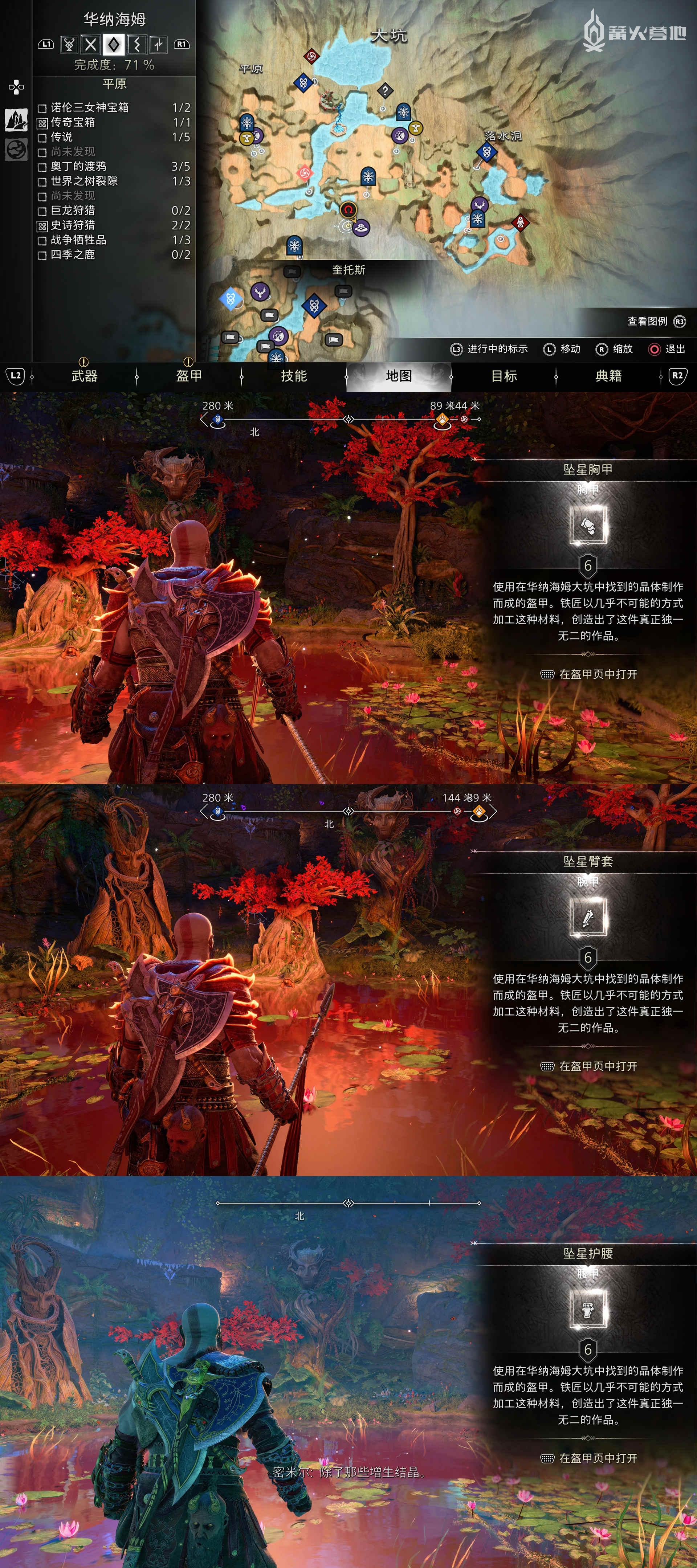 《战神 诸神黄昏》中包含大量套装盔甲,分为胸甲、腰甲和腕甲三种,一部分是通过主线或是推动流程在商店制作获得,还有一部分需要完成特定任务、开启特定宝箱后才能拿到或是去商店制作,本文将给出奎托斯、阿特柔斯等人的套装盔甲的获得方法(不包含特典服装)。