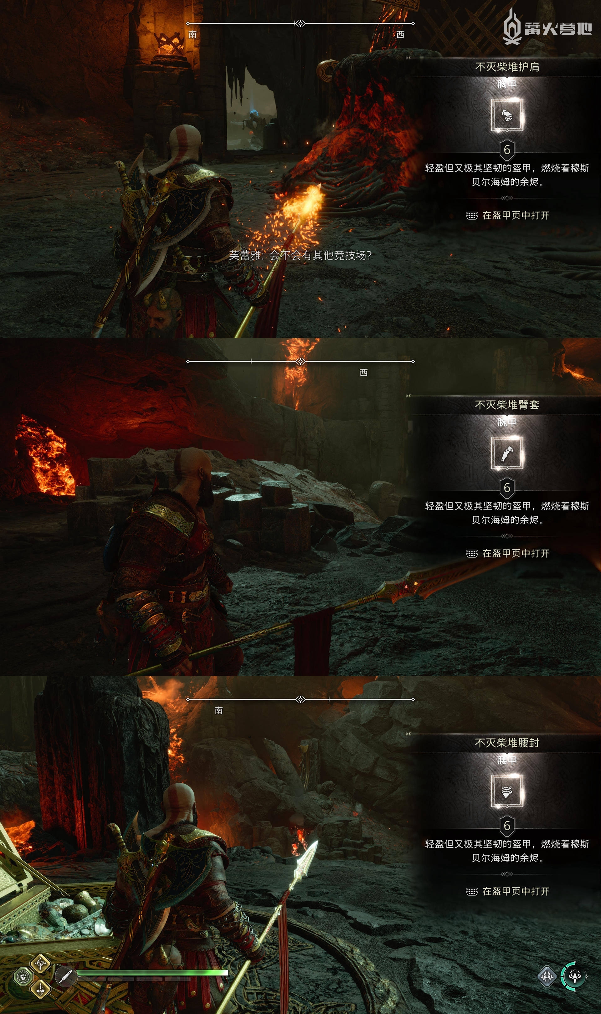 在「穆斯贝尔海姆 - 坩埚」,完成 F N R 三个剑的六个挑战,会分别获得「胸甲 - 不灭柴堆护肩」「腕甲 - 不灭柴堆臂套」「腰甲 - 不灭柴堆腰封」。