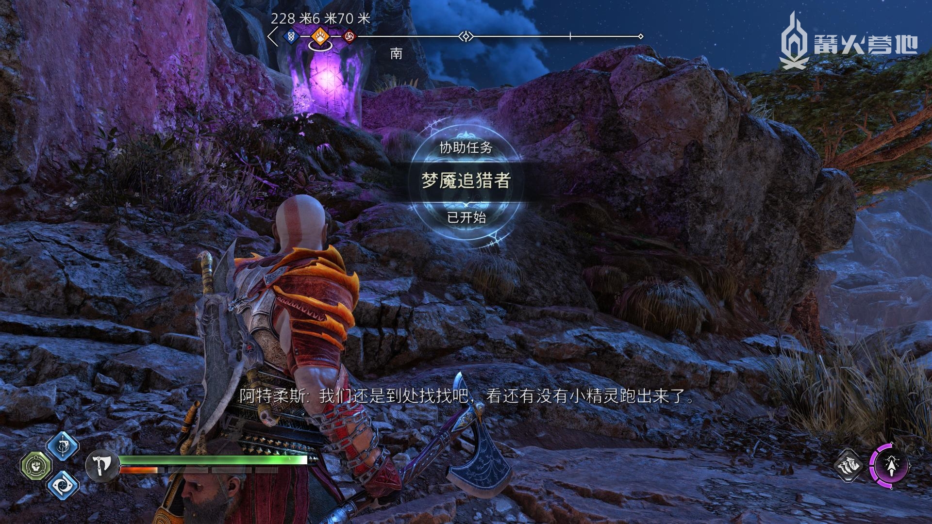 ② 在「华纳海姆 - 平原」(夜晚),下图位置可以找到正在侵蚀动物的小精灵,用双刀勾一下之后开启支线任务「梦魇追猎者」。