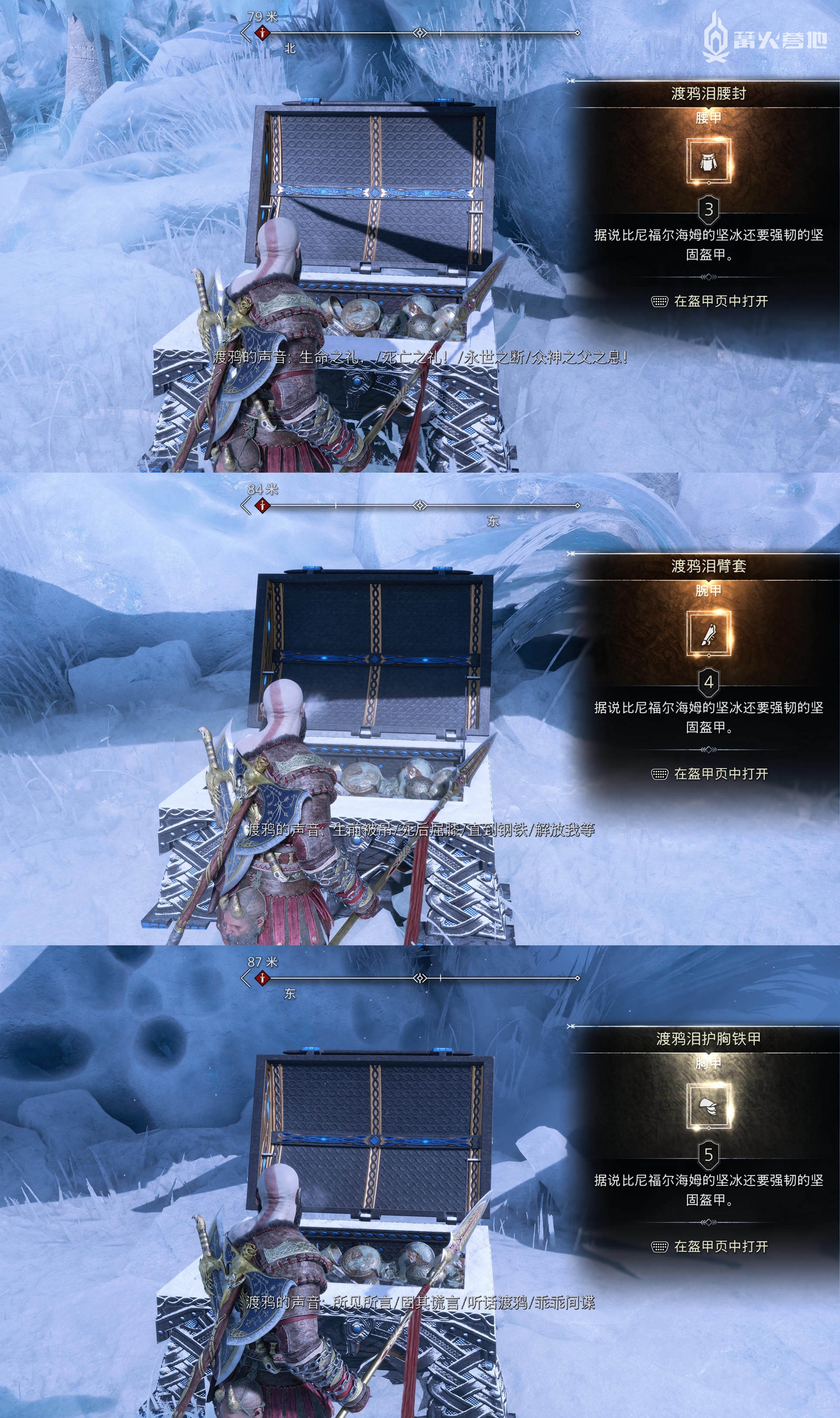 在「尼福尔海姆 - 渡鸦树」,打掉足够数量的渡鸦后可以在树下开宝箱,能获得「腰甲 - 渡鸦泪腰封」「腕甲 - 渡鸦泪臂套」和「胸甲 - 渡鸦泪护胸铁甲」。