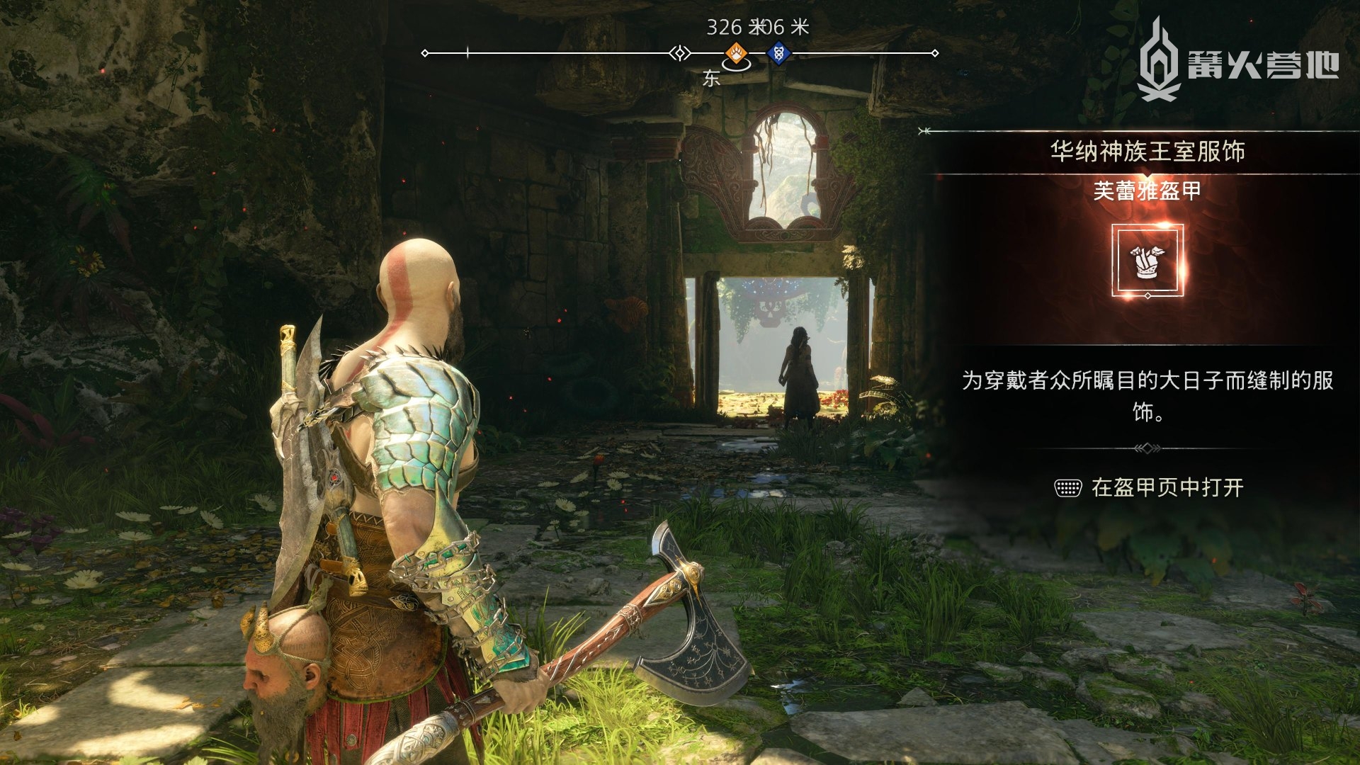 在「亚尔法海姆 - 荒原」,下图位置可以找到「传奇宝箱」,获得「腕甲 - 光辉护手」。