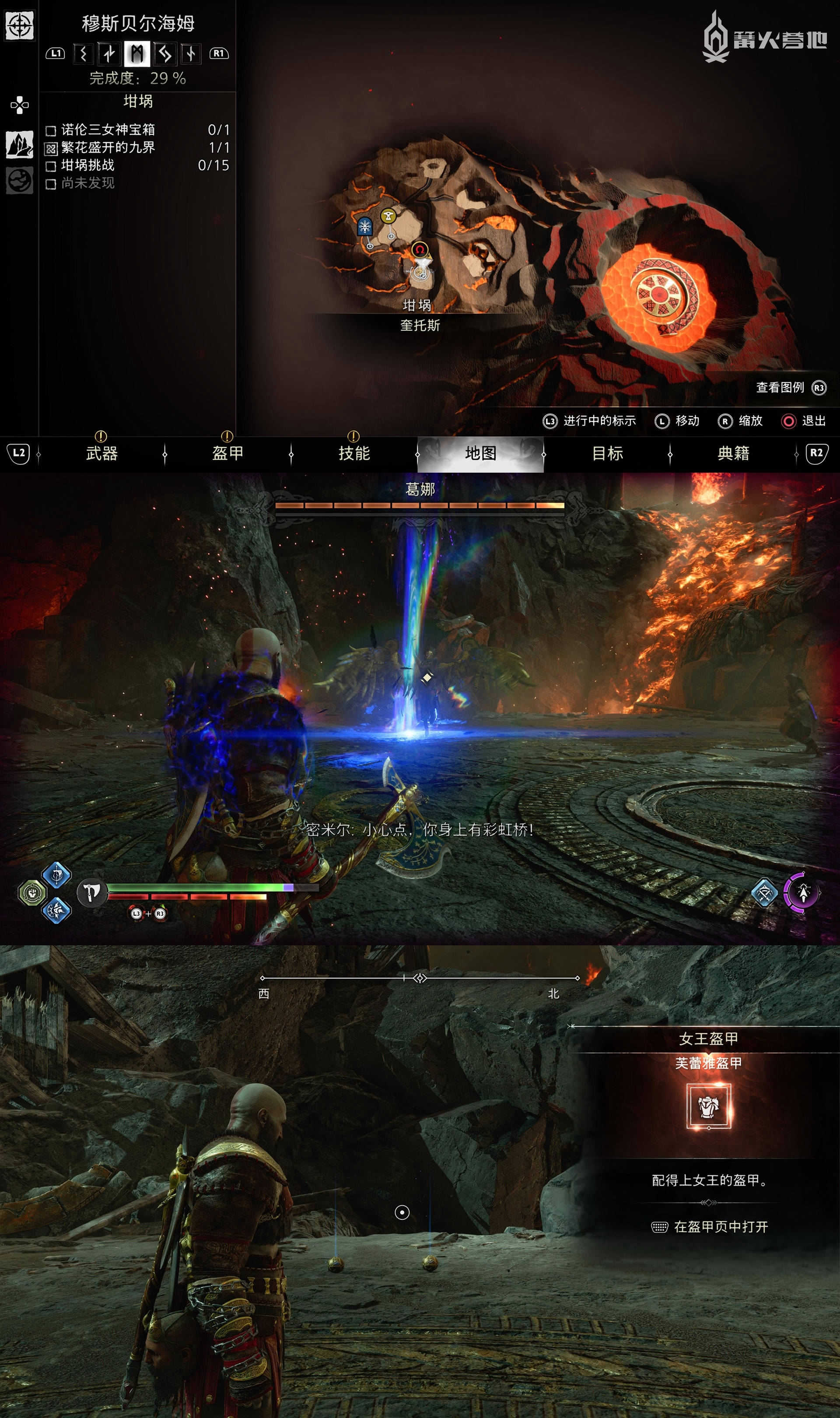 在「米德加尔特 - 九界之湖」,下图位置可以找到「符文解读 - 提尔的头盔」,捡到「胸甲 - 指引之光胸铠」。