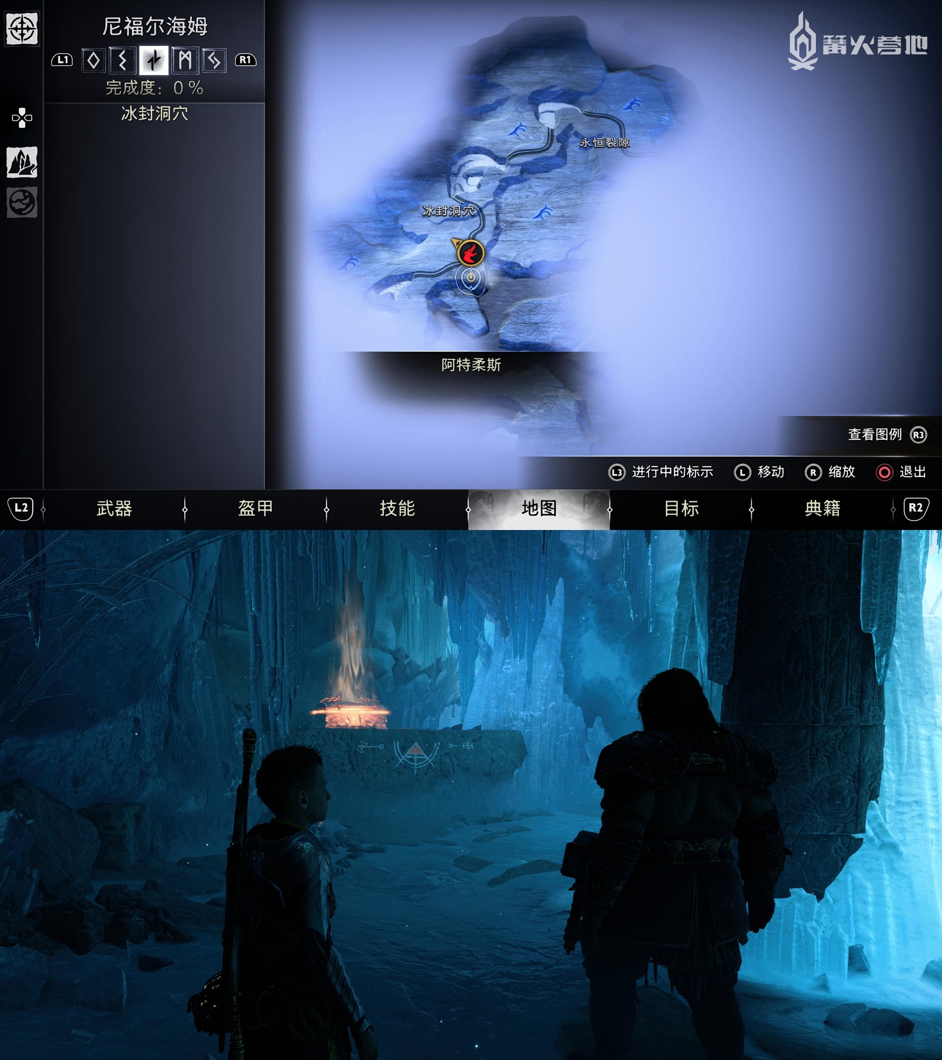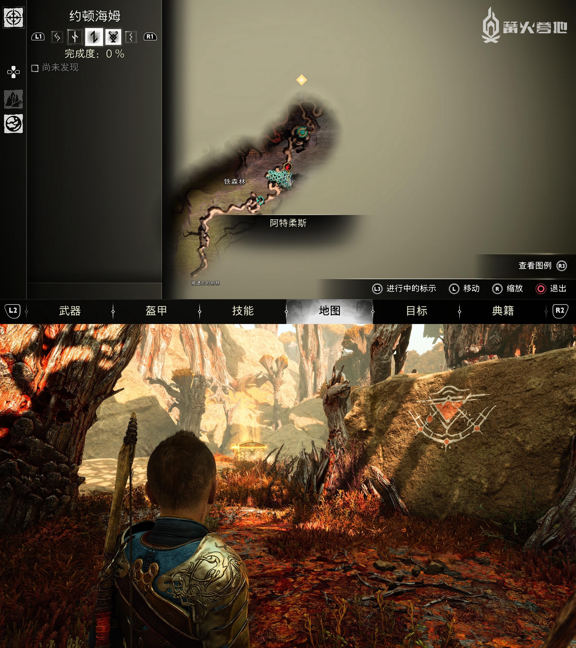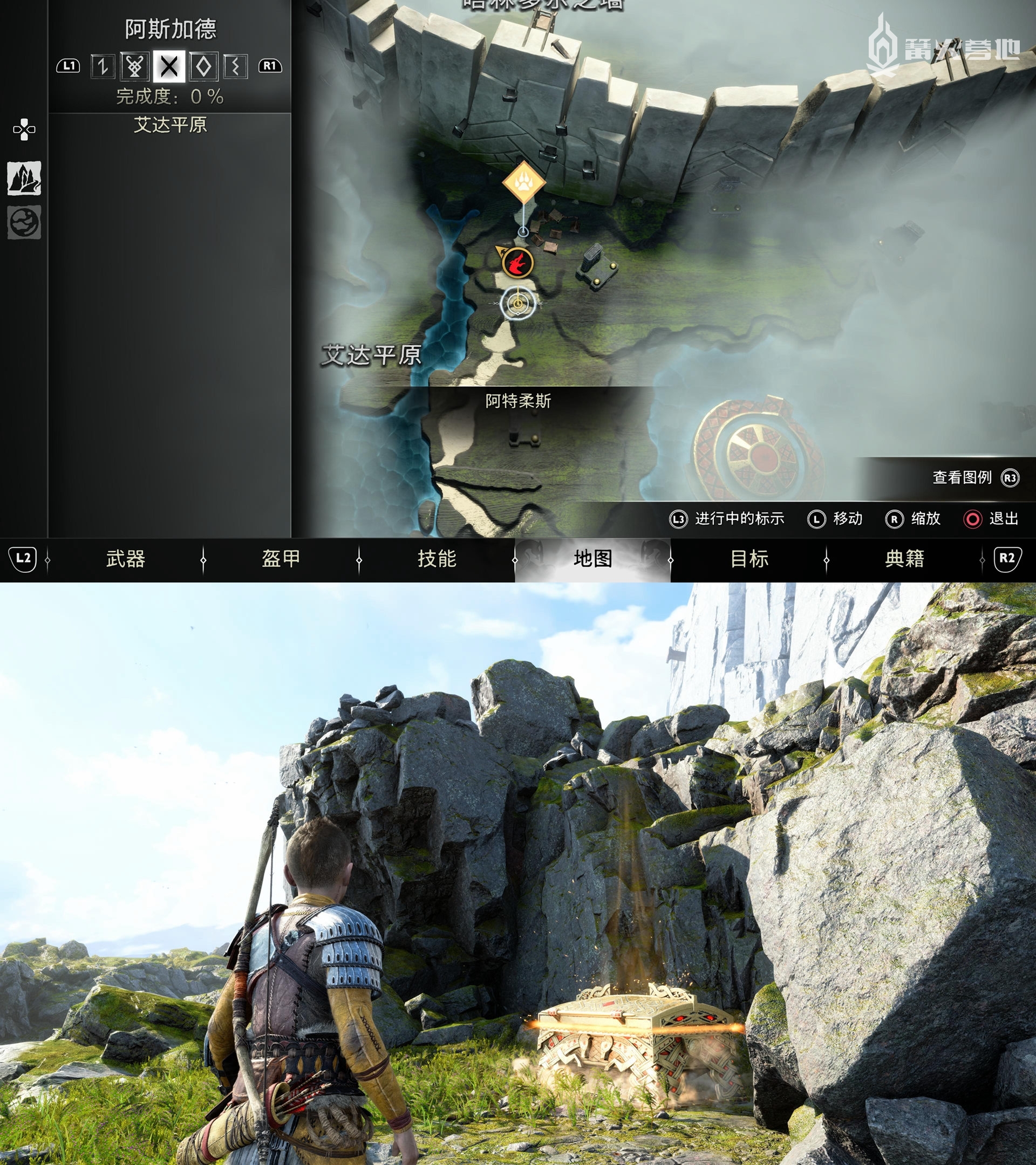 阿特柔斯关卡,在「阿斯加德 - 艾达平原」,用元素连锁爆炸通过篝火点燃植物,下图位置可以找到「传奇宝箱」,可以获得「弓能力 - 分裂魔符」,但不计入 100% 统计。