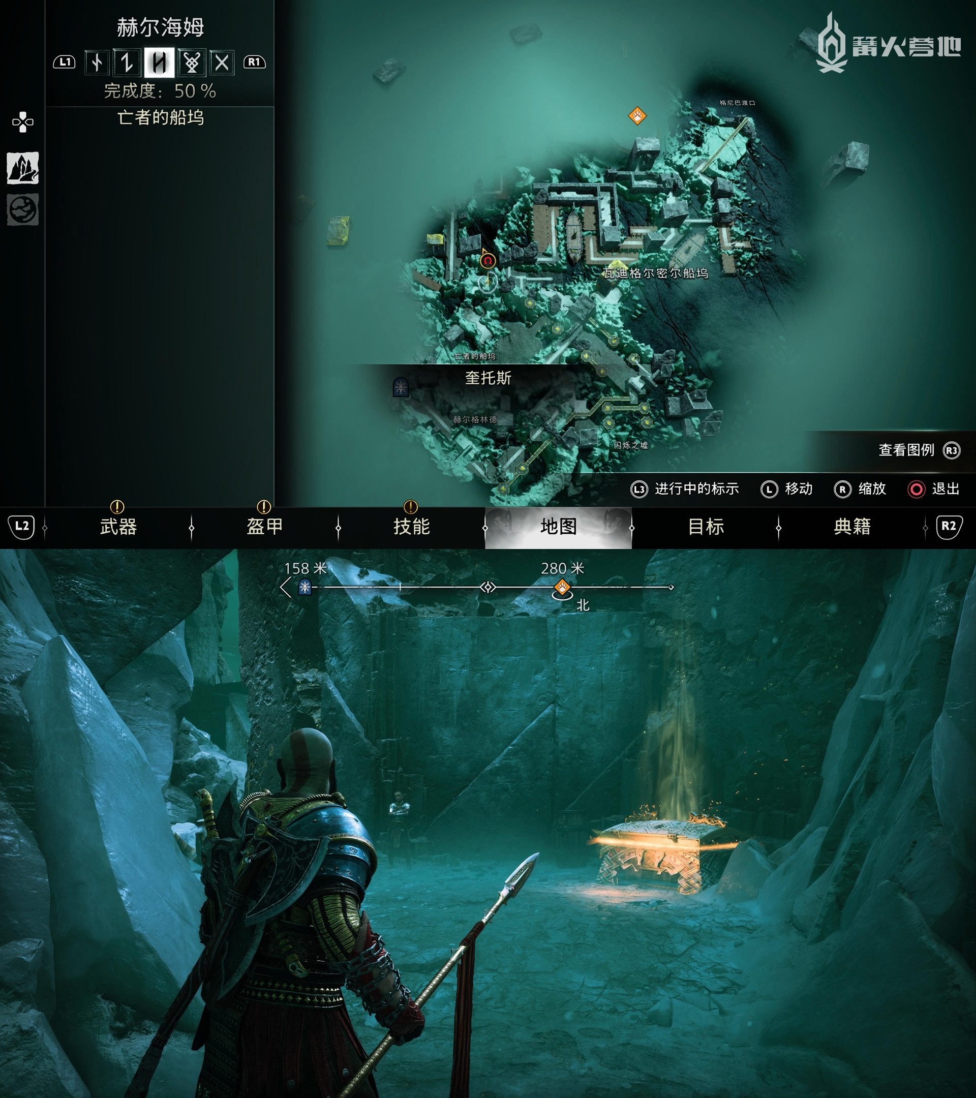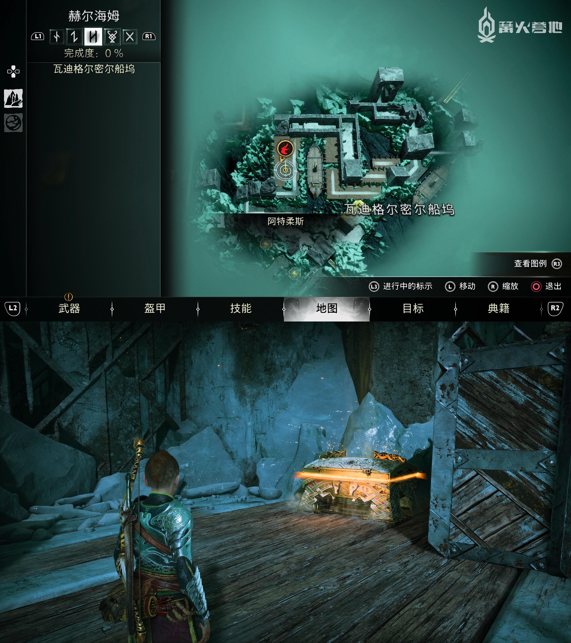 在「赫尔海姆 - 亡者的船坞」,下图位置可以找到「传奇宝箱」,打开获得「轻符文攻击 - 千军突刺」,但不计入 100% 统计。