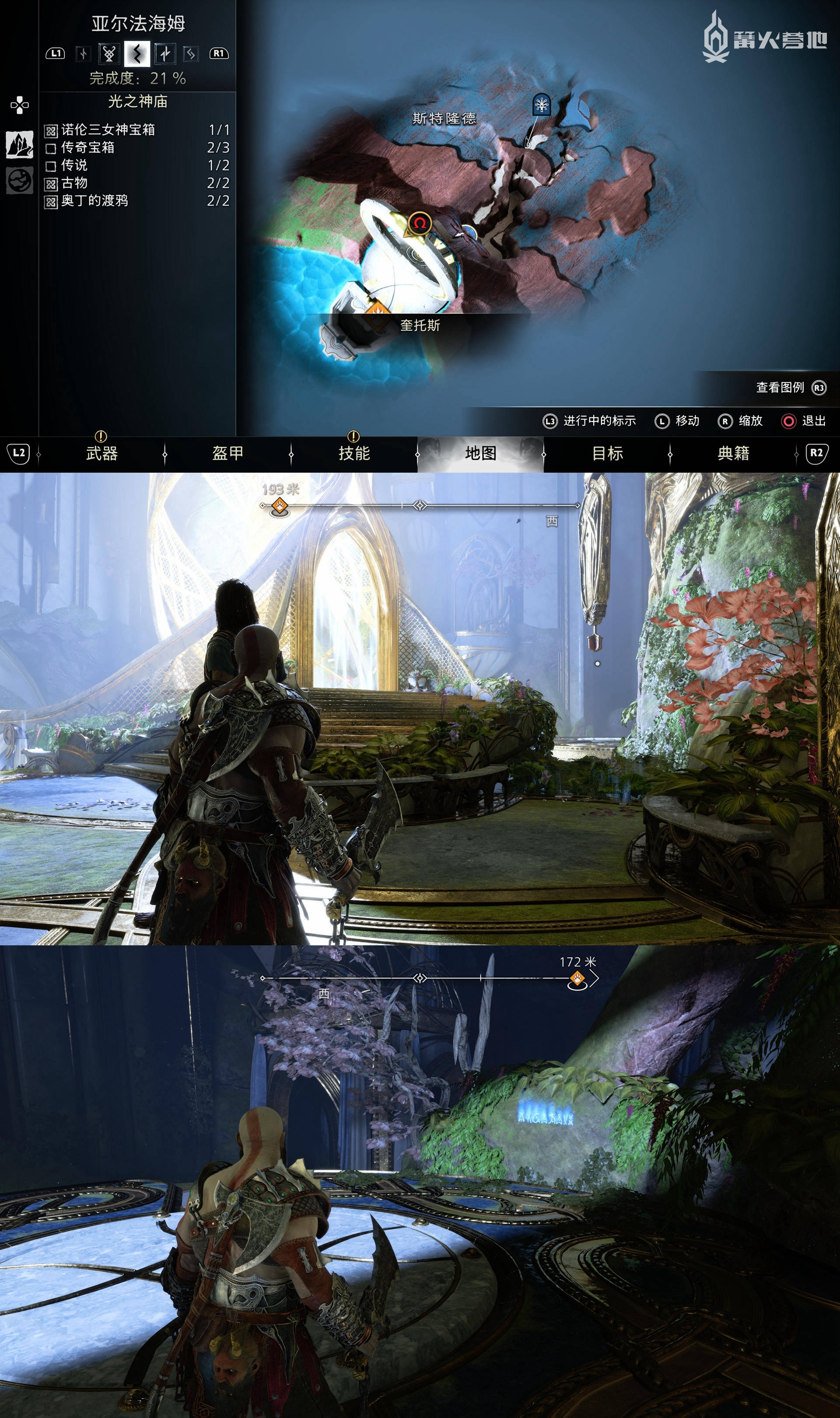 在「亚尔法海姆 - 光之神庙」,在下图位置用锁链荡到右边平台,能看到「符文解读 - 无限」。