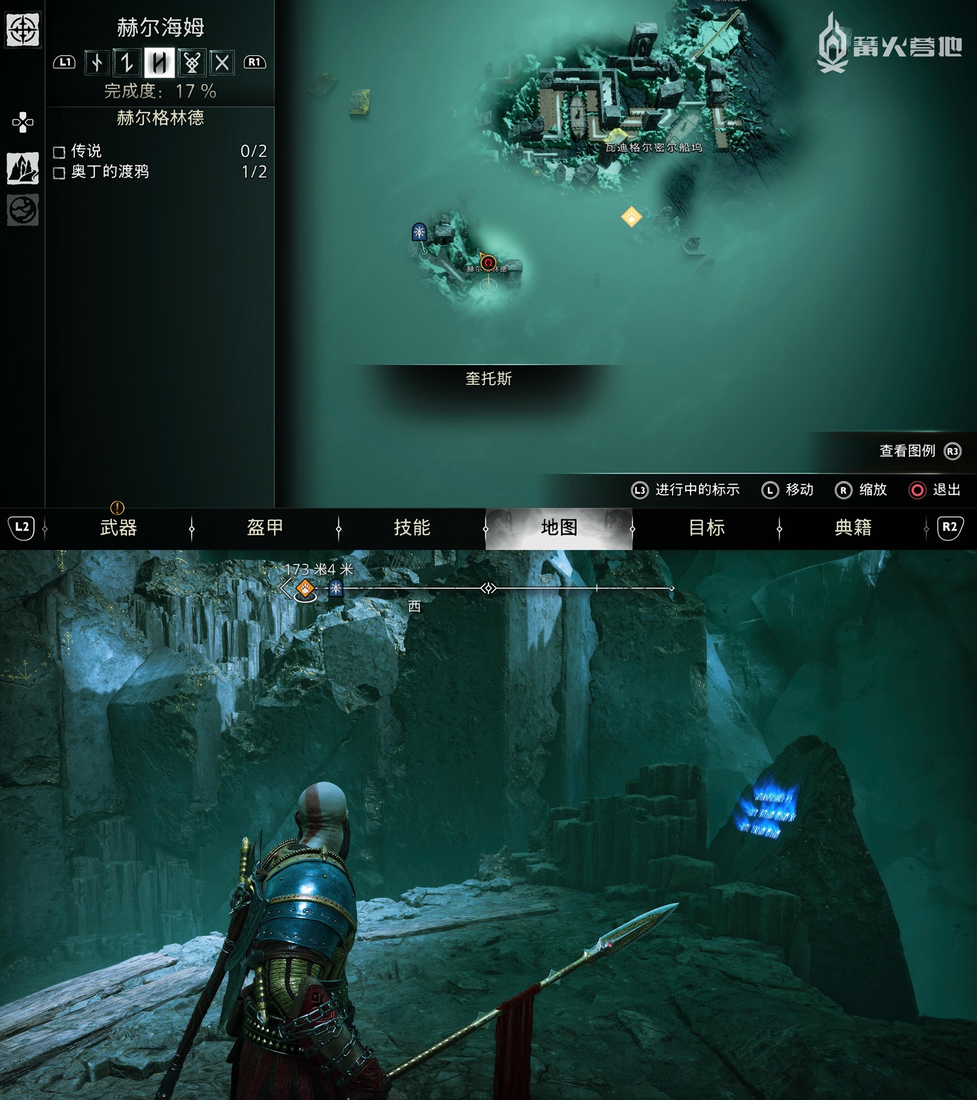 在「米德加尔特 - 九界之湖」,下图位置可以找到「符文解读 - 提尔的头盔」。