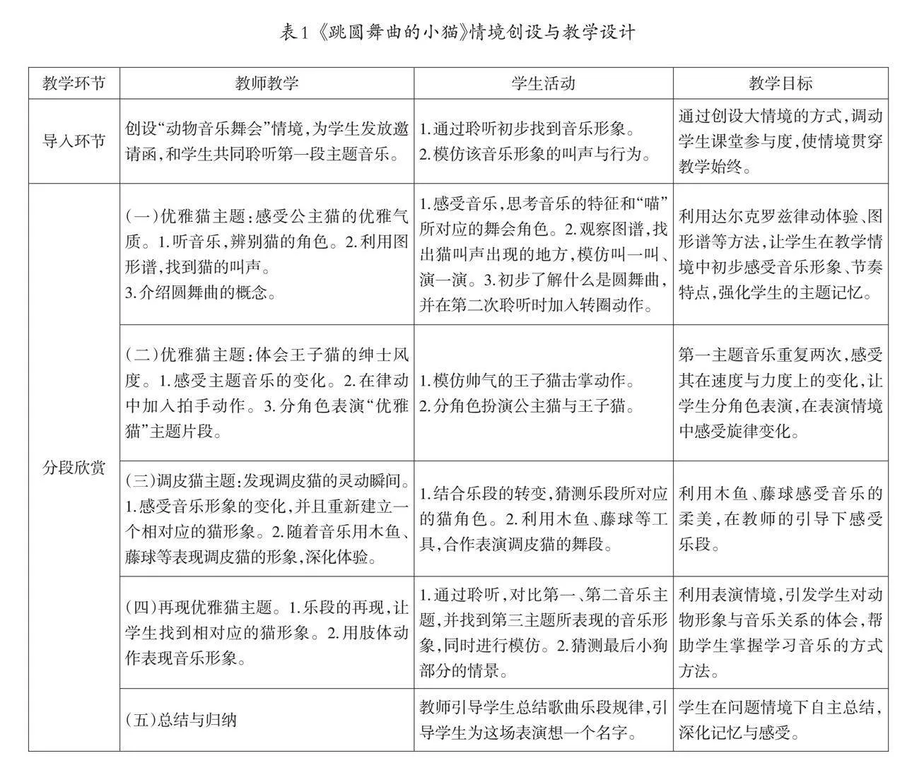 以人教版小学音乐一年级下册《跳圆舞曲的小猫》一课教学为例。这是一首专门为孩子所作的管弦乐,属于欣赏课的范畴。该课的教学重点在于:让学生能够感受圆舞曲的特点、乐曲中的动物形象以及情绪的变化。结合这一教学重点,教师可以创设如下教学情境,并引导学生分段欣赏,感受教学内容(如表1所示)。