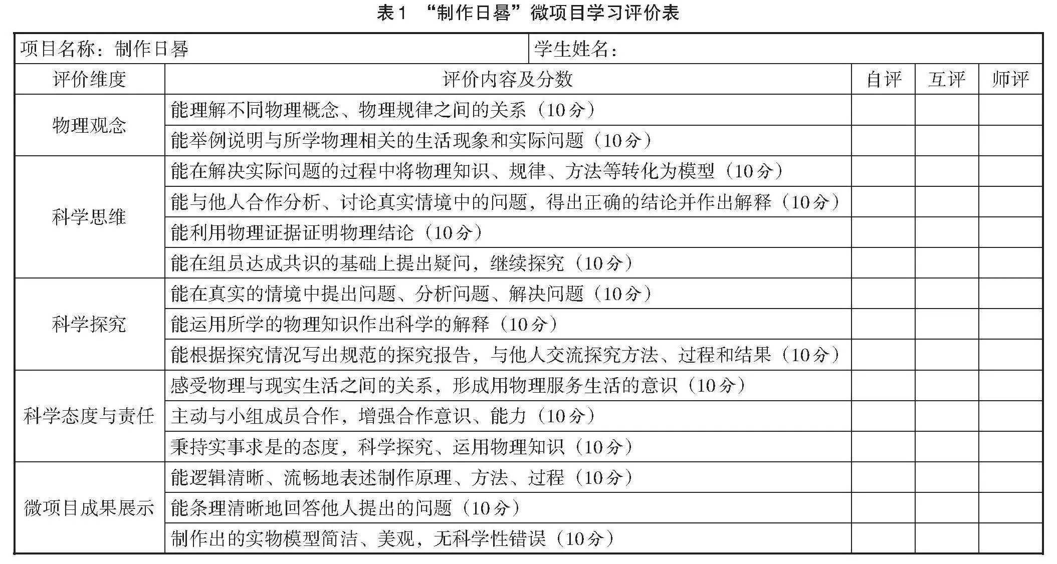 这里的微项目评价是指在微项目学习结束之际,教师和学生站在整体角度回顾微项目学习过程,依据微项目学习评价表中的评价维度和具体内容进行自评、互评、师评。有效的微项目评价便于教师、学生了解微项目学习的具体实施情况,也便于查漏补缺。尤其,一些学生可以在了解自身微项目学习情况的基础上,了解他人的微项目学习情况,由此发现自身不足和他人优点,主动扬长避短,提高自身的发展水平。教师可以依据微项目学习评价表,从不同角度、层面了解微项目学习的实施情况,发现问题、梳理原因、改进问题,推动微项目学习向更好的方向发展。例如,在“制作日晷”微项目学习结束之际,教师可以向学生发放如表1所示的“制作日晷”微项目学习评价表。