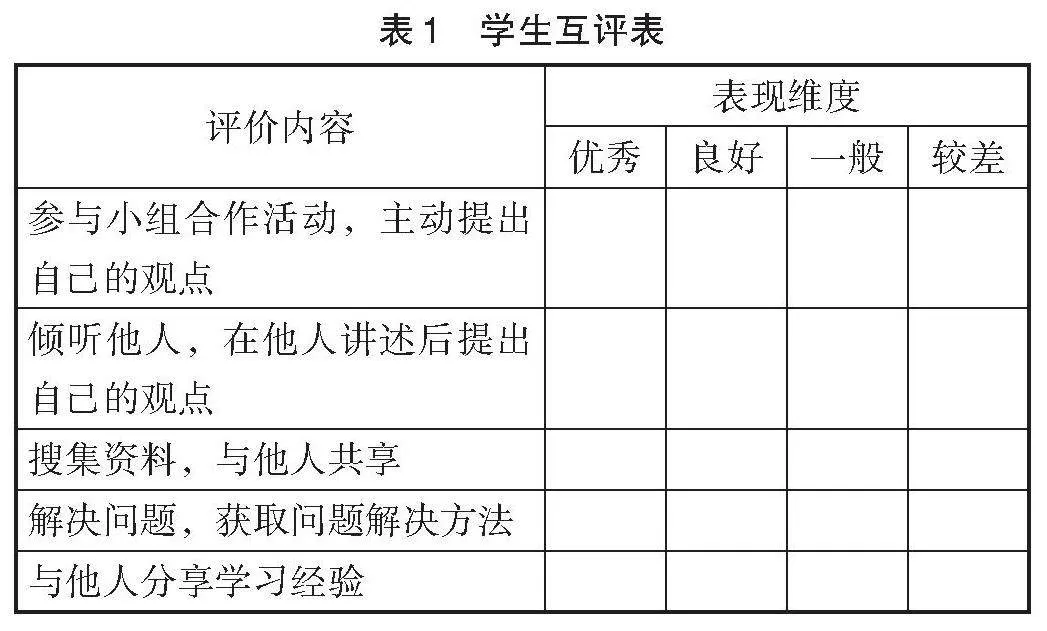 学生互评是一种以小组为单位、以学生之间的交流讨论为主要形式,以学生相互评价、相互学习为路径,以学生扬长补短为目的的评价方法。大部分学生缺乏互评经验。教师可以设计、发放互评表,让学生确定互评内容,有针对性地观察组员的学习表现,获得第一手资料,遵循客观、公正的原则填写互评表,如表1所示。