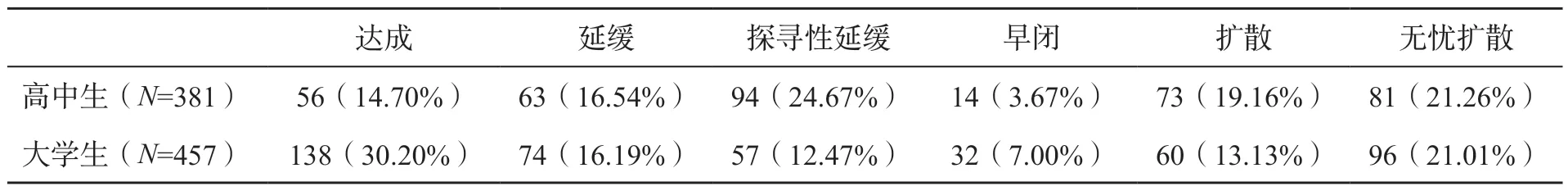 表6 高中生和大学生各职业同一性状态的人数分布(n3=838)