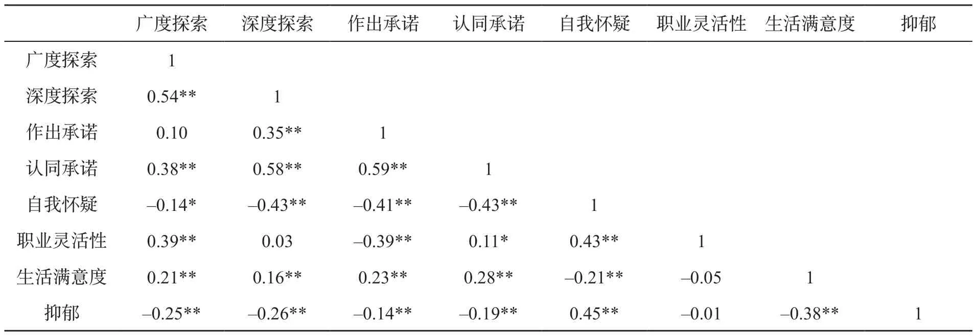 效标关联效度分析结果显示,自我怀疑与抑郁状况呈中高程度的显著正相关,与生活满意度呈显著负相关;广度探索、深度探索、作出承诺、认同承诺和抑郁得分呈显著负相关,与生活满意度呈显著正相关,与以往的研究结果一致。同时该结果也侧面证明了职业同一性状态不仅仅是有关职业信息的思考和确认,还是不安、抑郁等情绪及性格的复合型产物,与青少年和大学生的心理健康状态密切相关(Mauer&Gysbers,2011)。