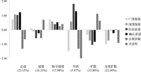 具体来讲,“达成状态”学生在职业探索(广度探索/深度探索)和职业承诺(作出承诺/认同承诺)方面的得分较高,而在职业反思(自我怀疑/职业灵活性)方面的得分较很低;“延缓状态”学生在职业承诺上得分较低,在探索方面处于中等水平,在职业灵活性维度得分较高;“探寻性延缓状态”学生在六个维度上得分都较高;“早闭状态”学生在职业承诺上得分较高,在自我怀疑和职业灵活性方面得分较低;“扩散状态”学生在职业探索和承诺方面较低,在自我怀疑和职业灵活性方面得分较高;“无忧扩散状态”学生在职业探索过程得分较低,在两个职业承诺维度都处于中等水平,对职业的灵活性程度较低。
