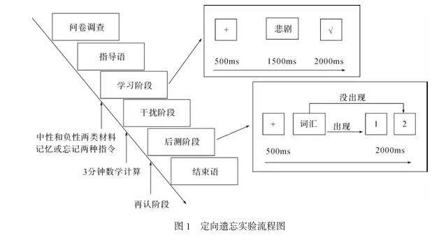 采用项目法定向遗忘范式。实验前,被试按要求填写问卷。实验分为三个阶段:(1)学习阶段:首先,屏幕上呈现指导语,被试理解操作任务之后开始实验,屏幕中央呈现一个“+”注视点500ms,接着呈现词语1500ms,随后呈现指令2000ms(“×”代表“忘”,“√”代表“记”),共100个试次;(2)干扰阶段:学习结束后,为了防止复述,安排3分钟的无关学习任务(简单数学计算题);(3)后测再认阶段:随机呈现200个词语(100个旧词和100个新词),被试需要再认测试,学过按“1”,未学过按“2”,记录判断正确率。具体实验流程见图1。