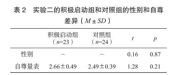 按照自愿原则,选取中学生47名,并随机分配至积极启动组和对照组。积极启动组中,未能成功回忆起至少三件自豪或满意事情的被试归入对照组。最终,积极启动组共23名被试,其中男生10名,女生13名;对照组共24名被试,其中男生11名,女生13名。积极启动组和对照组在性别、自尊水平上均无显著差异(见表2),且所有被试均无精神疾病,视力正常或矫正后正常,未参加过类似实验。实验前,被试被告知实验相关信息,并在实验结束后获得精美礼物。